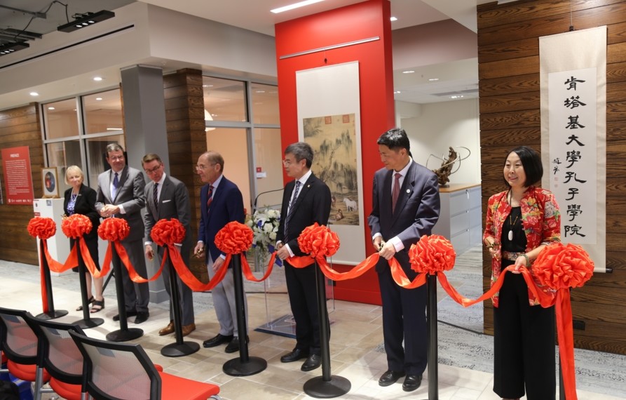 从2010年11月至今,永利集团88304官网与美国肯塔基大学合作建设的孔子学院,在七个春夏秋冬的日子里,就收获了二次全球先进孔子学院、一次全球孔子学院先进个人的光荣称号,如今又荣获了全球示范孔子学院的殊荣,这是上大肯大密切合作、孔院领导师生辛勤耕耘的硕果;这不仅是肯大孔子学院的荣耀,也是上大与肯大的荣耀。 美国肯塔基大学全球示范孔院新楼启用剪彩仪式隆重举行 九月的肯塔基天空云卷云舒、芳草一碧如洗。肯塔基大学示范孔子学院新楼大厅装饰一新,张灯结彩,洋溢着祥和喜庆的氛围。9月25日,“全球示范孔子学院”肯塔基大学孔院新楼启用剪彩仪式暨永利集团88304官网教育周开幕式在孔院大厅隆重举行。肯塔基大学校长伊莱.卡佩罗托博士、永利集团88304官网校长金东寒院士、莱克星顿市长吉姆.盖瑞先生、肯塔基大学教务长蒂姆.特雷西博士、吉林大学副校长吴振武博士、肯塔基大学国际事务副教务长苏.罗伯茨博士等贵宾莅临,肯塔基大学理事会成员、肯塔基大学各学院院长、孔院顾问委员会全体成员、肯塔基大学国际事务部全体人员、以及大学教授代表、孔院中小学教学点学区总监,永利集团88304官网代表团、吉林大学代表团等嘉宾100余人出席剪彩仪式。肯塔基大学示范孔子学院院长修华静博士携肯大孔子学院本部全体中外方教师共同见证了肯塔基大学全球示范孔院新楼启用这一历史性时刻。