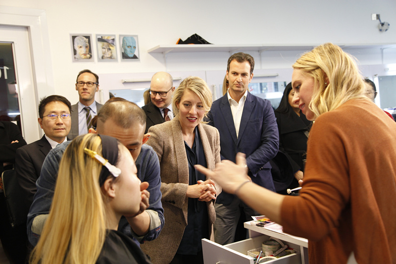 随后代表团观摩了影视化妆专业系主任考特尼·弗雷(Courtney Frey)的化妆教学,并参观了特效化妆实验室,了解了特效面具的制作流程和设施设备。
