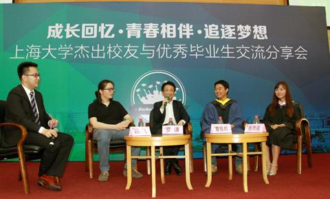 分享会由罗谦和吕飞两位校友的微演讲拉开序幕。两位校友回顾了自己大学时学习生活和之后的工作经历,展示了自己的成长轨迹,同时也表达了对母校的深深眷恋和感恩之情。随后,罗谦和吕飞校友与2015届毕业生代表——社会学院本科毕业生周雨薇以及环化学院硕士毕业生曹振邦一起从“成长”、“青春”和“梦想”三个方面交流了各自的看法。对即将踏入社会的毕业生,罗谦校友赠言各位大学生要坚持自己的目标,永葆激情;吕飞校友则建议大家做好“选择”,把握机会,不断提升自己。