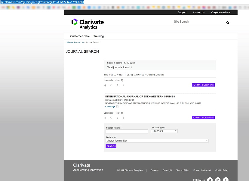 近期,“永利集团88304官网国际合作平台永利集团88304官网宗教与中国社会研究中心”与芬兰“国学与西学北欧论坛”合作出版的国际期刊International Journal of Sino-Western Studies(《国学与西学》,ISSN:1799-8204;网络版ISSN:2242-2471)由ESCI数据库正式收录。ESCI是由汤森-路透集团于2015年11月推出,采用与SCI(自然科学)、SSCI(社会科学)、A&HCI(艺术与人文学)等三大数据库相同的引用指数和评价系统,并特别注重所选期刊的多学科性、地域性和新兴领域。具体收录情况可访问此网站:http://ip-science.thomsonreuters.com/cgi-bin/jrnlst/jloptions.cgi?PC=EX