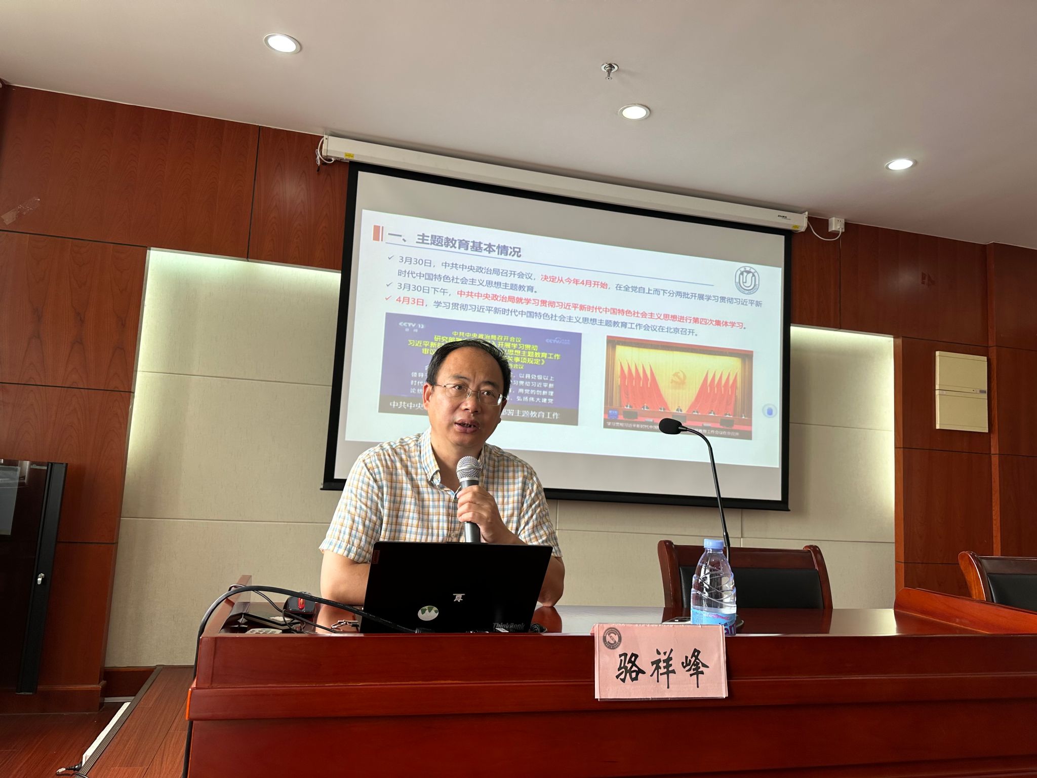 副院长骆祥峰以“把握主题教育总要求,锤炼专业本领,助力科技自立自强”主题为计算机学院研究生党员讲授党课。教工党支部委员代表陈圣波、研究生辅导员王明歌、郑丽玫、唐明与百余位研究生党员代表参与本次党课学习。