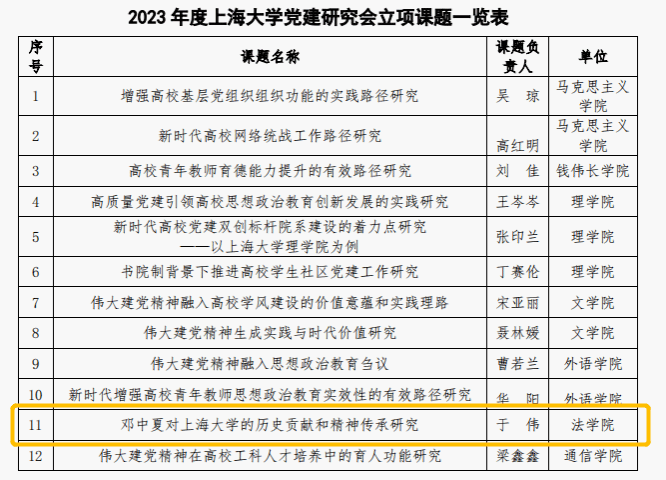 法学院中夏党支部是以邓中夏先烈名字命名的特色党支部,加强邓中夏先烈的革命精神的研究和传扬,既是支部内在建设的需要,也是深入开展主题教育的内在要求。在支部党员、法学院党委副书记、副院长于伟同志的带领下,支部部分党员积极构思选题、多方搜集文献资料,以“邓中夏对永利集团88304官网的历史贡献和精神传承研究”为题积极申报2023年度永利集团88304官网党建研究课题,并获得成功立项。