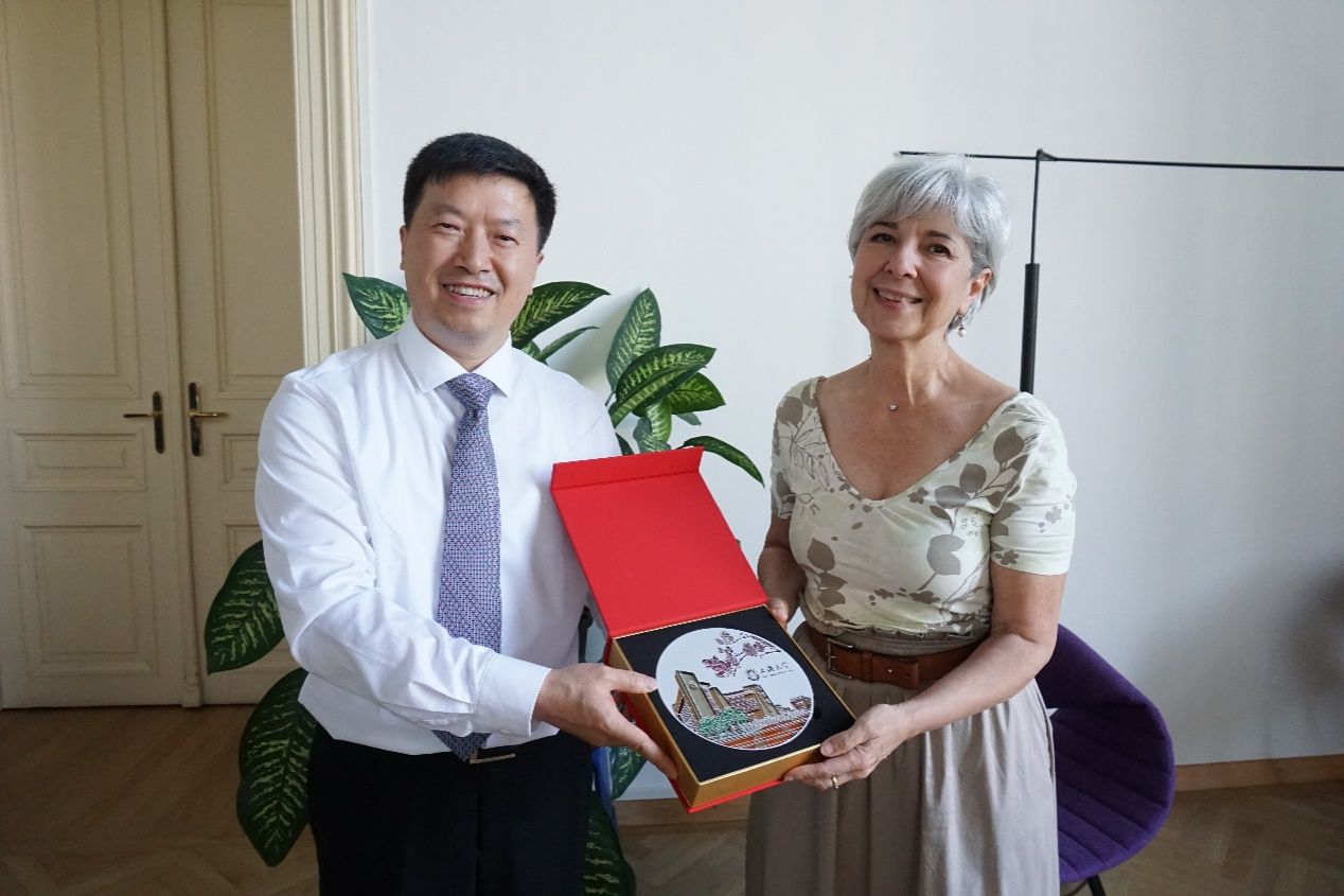 刘校长赠与维也纳副校长ManuelaBaccarini我校纪念品