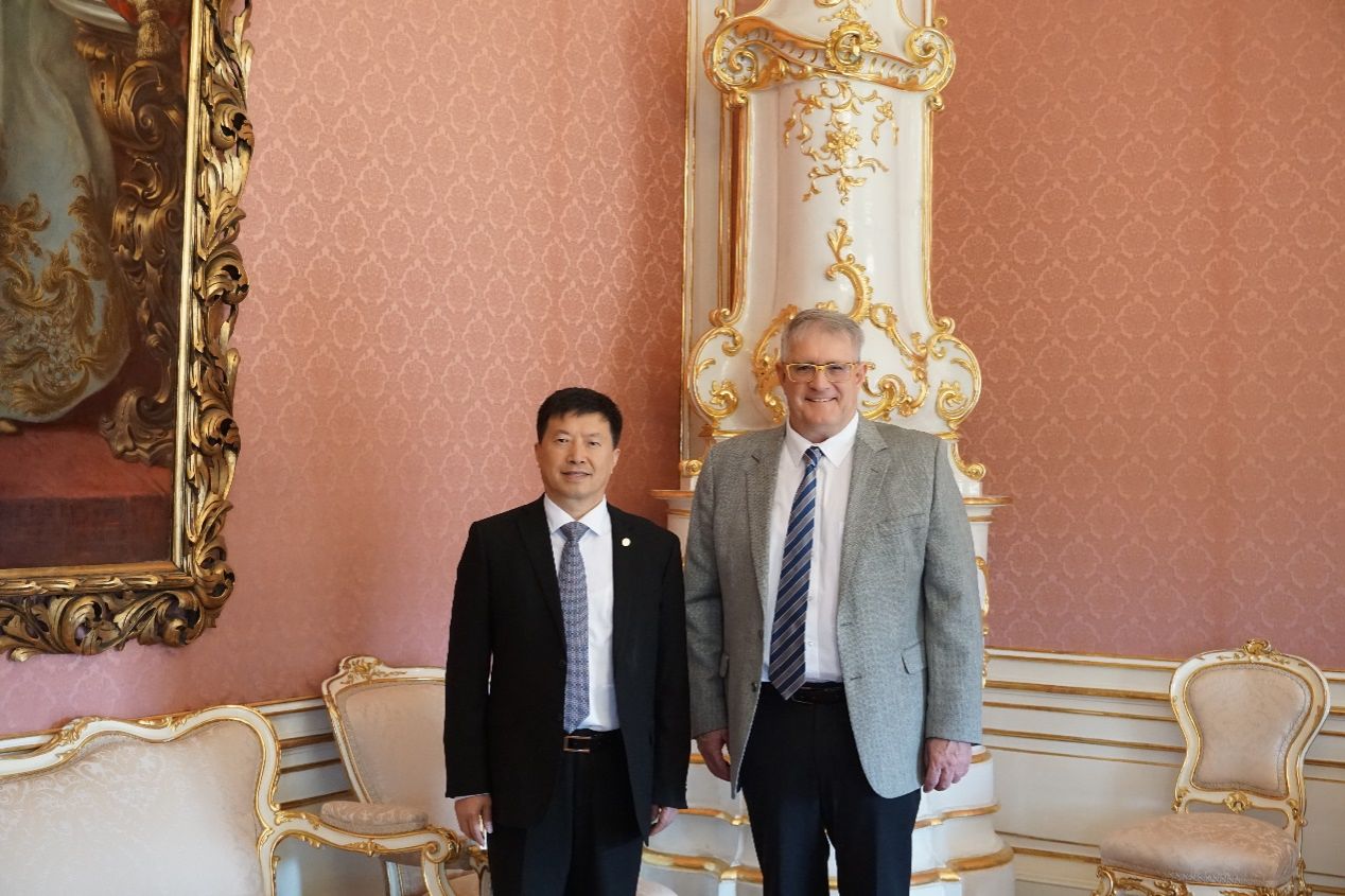 此次访问IIASA,也受到了我国常驻维也纳联合国和其他国际组织代表团的关心和支持,公使参赞沈钢和参赞扈黎光全程参与了我校与IIASA的会谈。会后,特命全权大使李松先生专门会见了刘校长及IIASA总干事和副总干事等人员,从国家外交战略出发提出了合作建议。刘校长向大使介绍了我校近年高质量发展成果,以及与IIASA的合作基础和规划,表示永利集团88304官网将继续深化与IIASA在国际科研和高层次人才培养领域的合作,在提升永利集团88304官网国际影响力的同时,努力扩大我国在国际社会的话语权。