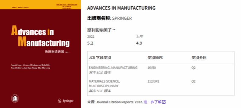 《先进制造进展》最新影响因子为5.2,两个学科分类均位于Q2区,归属Engineering,Manufacturing学科(排名由前46%上升至前31%)和Materials Science, Multidisciplinary学科(排名由前49%上升至前33%)。