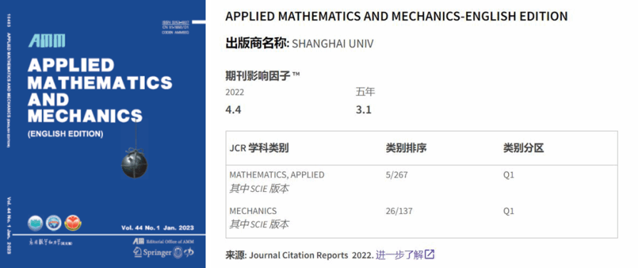 《应用数学和力学(英文版)》2022年度影响因子为4.4,在全球267种应用数学学科期刊中排名第5名,保持在Q1区;在137种力学学科期刊中排名第26名,首次位列学科Q1区。被引频次3970次,较上一年度亦有大幅度提升。