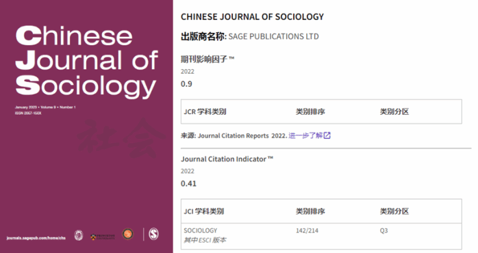 《社会》英文刊获得首个影响因子0.9,在JCI 214种社会学期刊中处于Q3区。该刊的2022年CiteScore引用分创新高,体现了良好的发展前景。