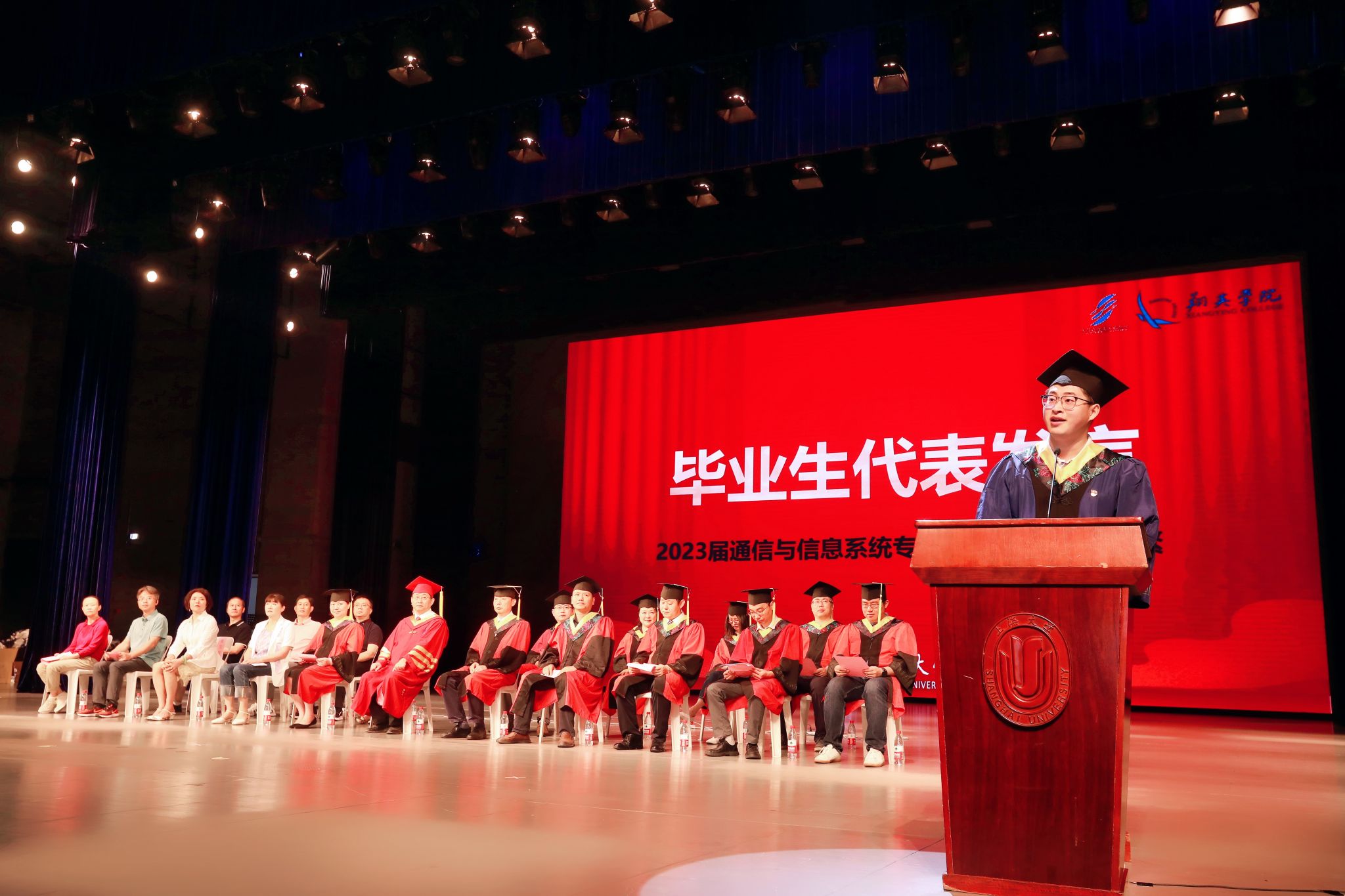 2023届本科毕业生、上海市优秀毕业生刘璇作为本科生代表发言。她代表所有毕业学生向一路以来悉心培养的老师们表示诚挚的敬意和衷心的感谢,提到希望大家要做胸怀大智并脚踏实地,做富有责任并勇挑重担的通信人。
