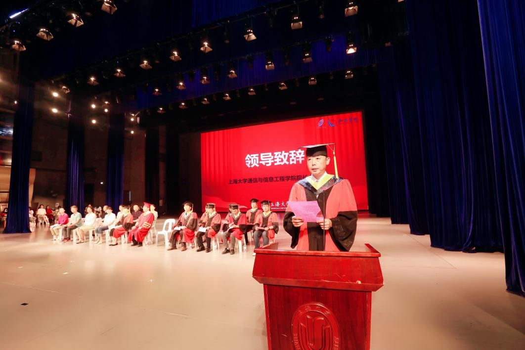 在庄严的国歌声中,毕业典礼正式拉开帷幕。观看完钱伟长老校长的毕业赠言后,王廷云院长为典礼致辞,充分肯定了同学们在求学过程中取得的成绩,祝贺毕业生们圆满完成学业、顺利毕业,并鼓励他们在未来的人生道路上展现出上大通信-翔英人敢为人先,笃实自强的独有特质。