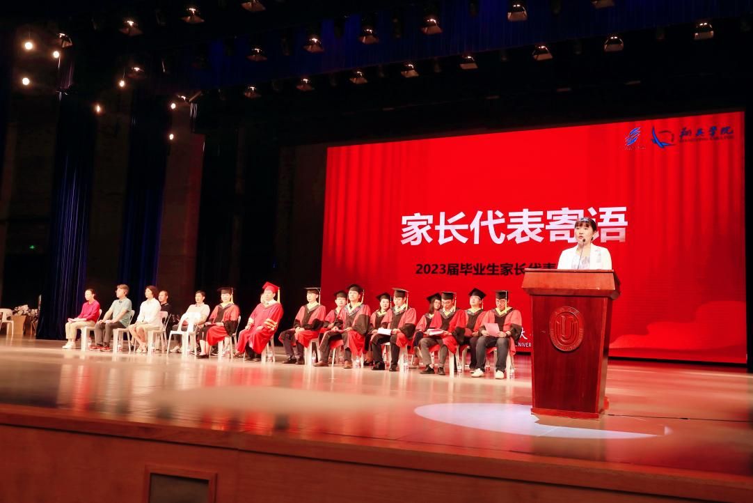 2023届本科毕业生赵晨的母亲徐纯香作为家长代表发言,表达了对毕业生们的深深祝福,鼓励学子们勇敢踏上新旅程,追逐青春梦想,塑造属于自己的人生。