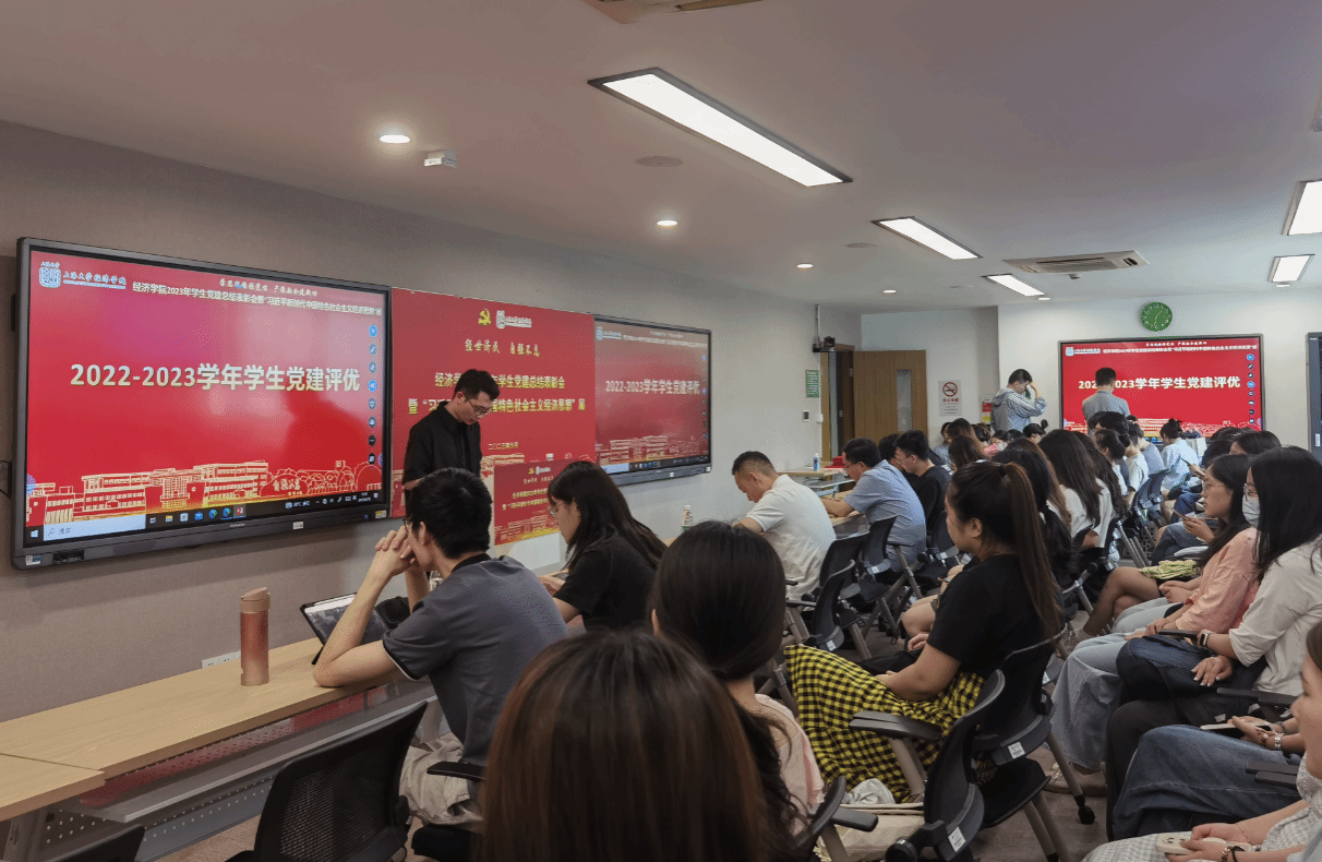 会议在全体与会人员齐唱国歌声中拉开帷幕。随后,大家一起通过视频短片回顾了经济学院这一学年来学生党建的工作开展情况。2022-2023学年,经济学院学生党建工作在校院两级党委的统筹带领下,在学工办和研工部的关心指导下,结合主题教育等党建工作要求,夯实党组织基础、严守发展党员质量、提升组织生活品质、打造特色品牌项目,受到同学们的肯定和欢迎。