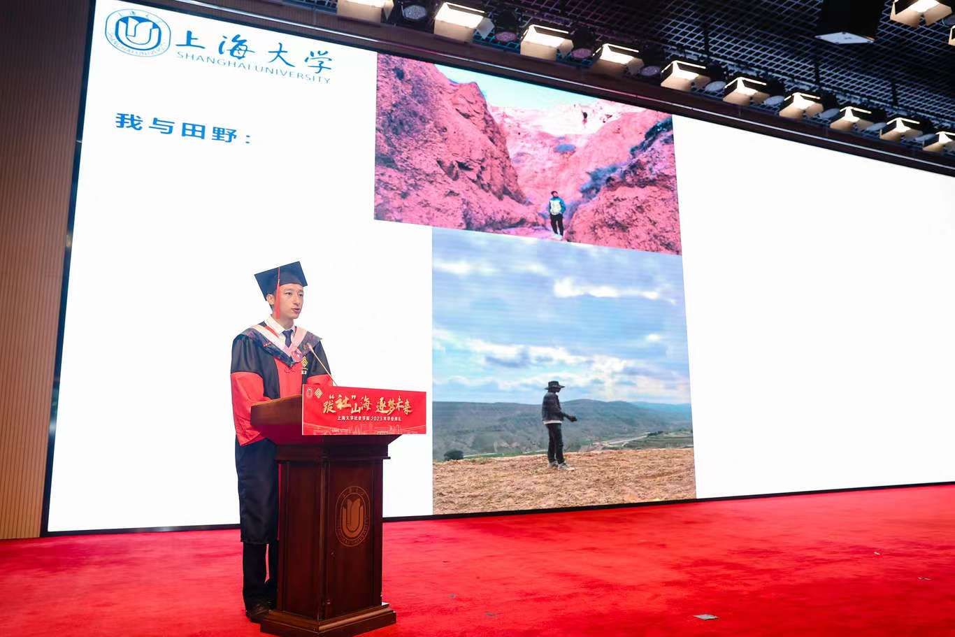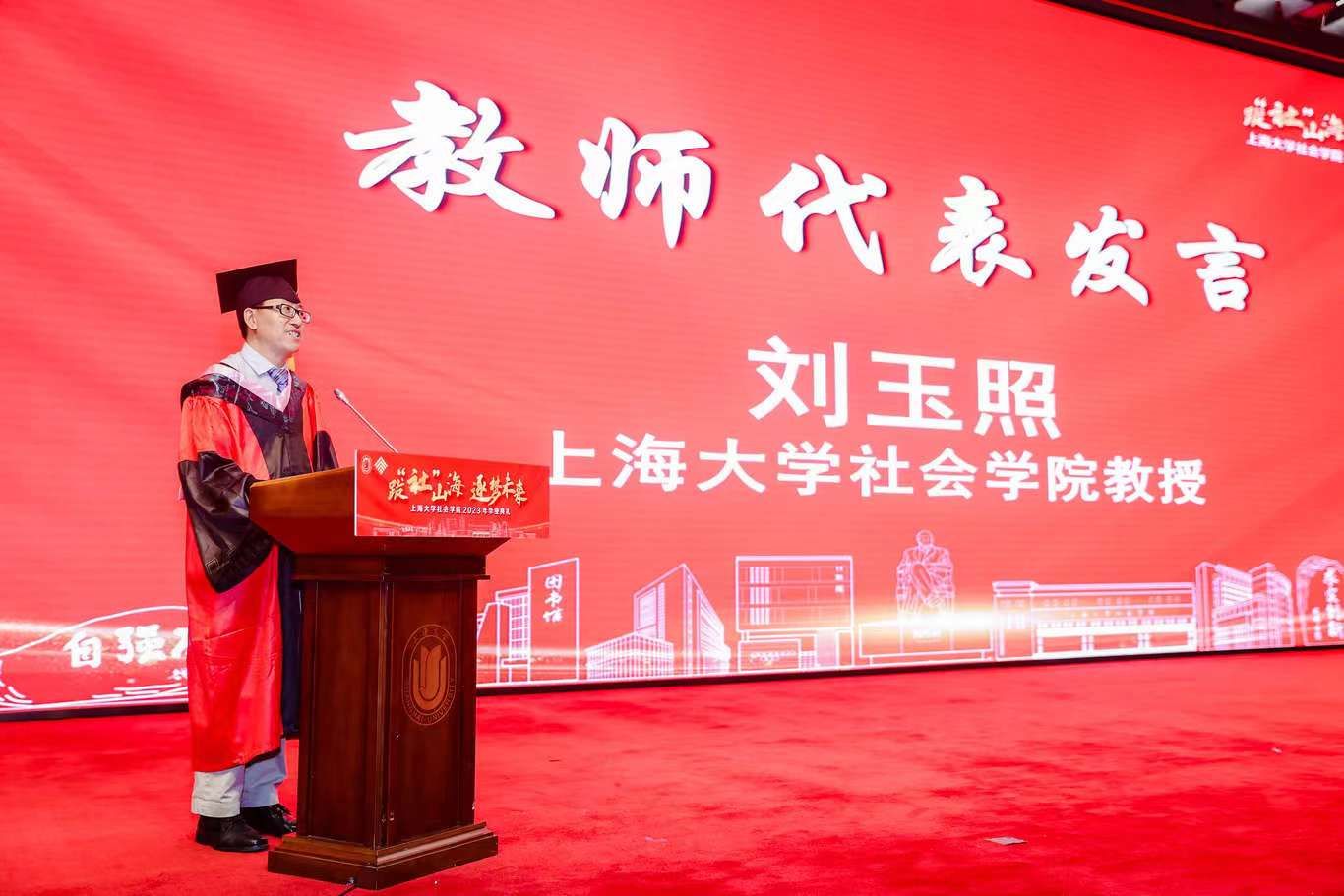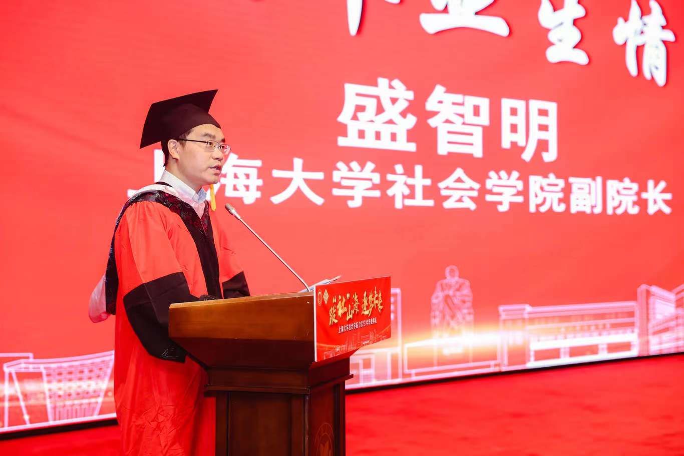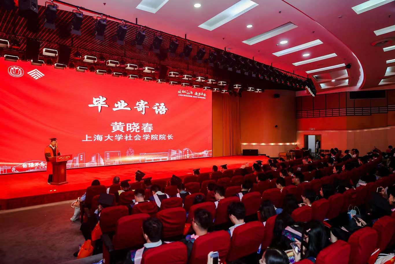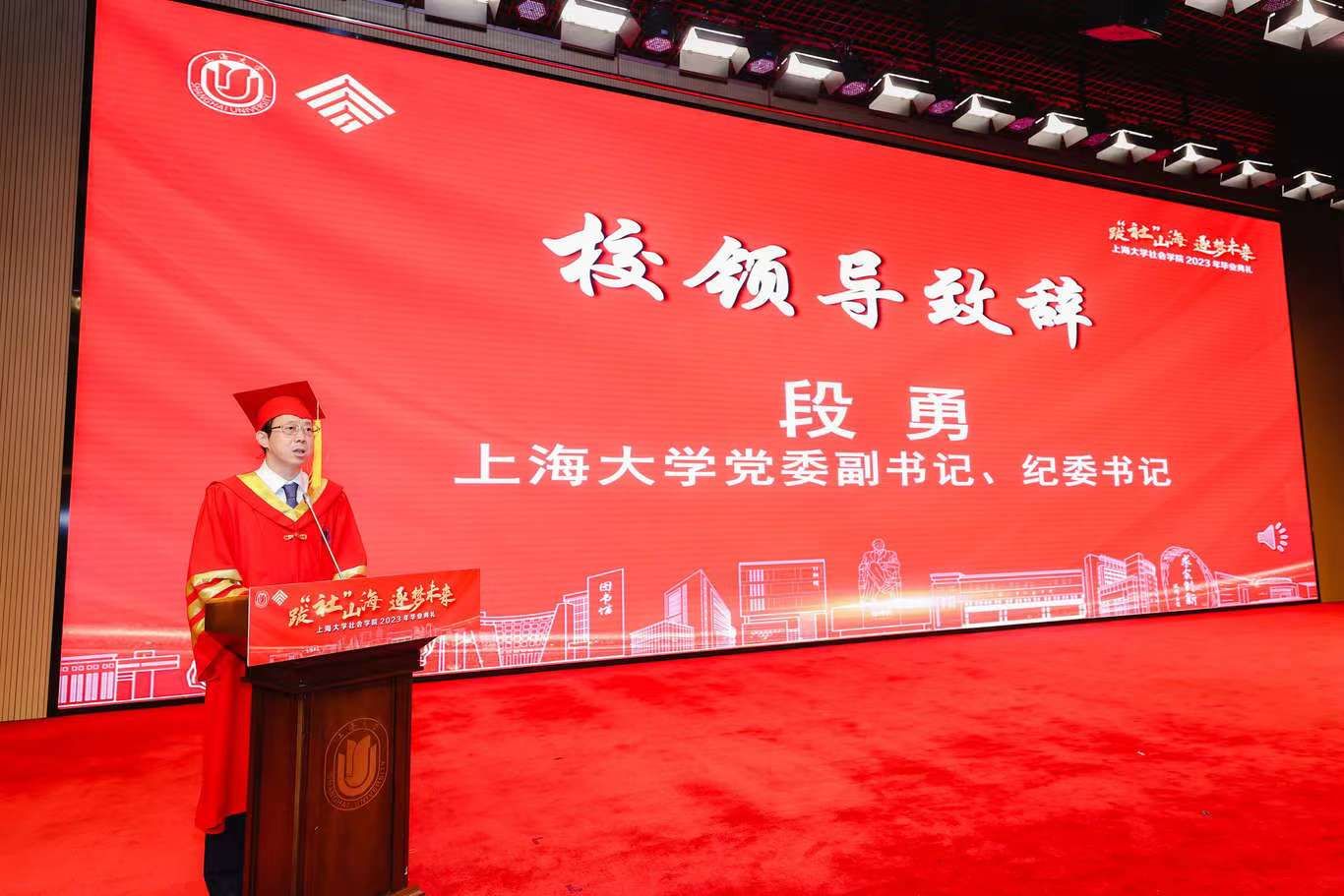 典礼伊始,校党委副书记、纪委书记段勇上台致辞。他表示,2023届的毕业生是特殊的一届毕业生,经历了跌宕起伏的校园生活,又即将面对风险重重的未来。鉴于此,段书记为2023届毕业生献上了八字箴言,即“健康、平安、幸福、成功”。段书记将于右任校长的“江山有待”与钱伟长校长的“自强不息”赠予毕业生们,祝福他们的同时也希望他们在走出社院后依然谨记两位校长的教导,继往开来、得见前路坦荡。