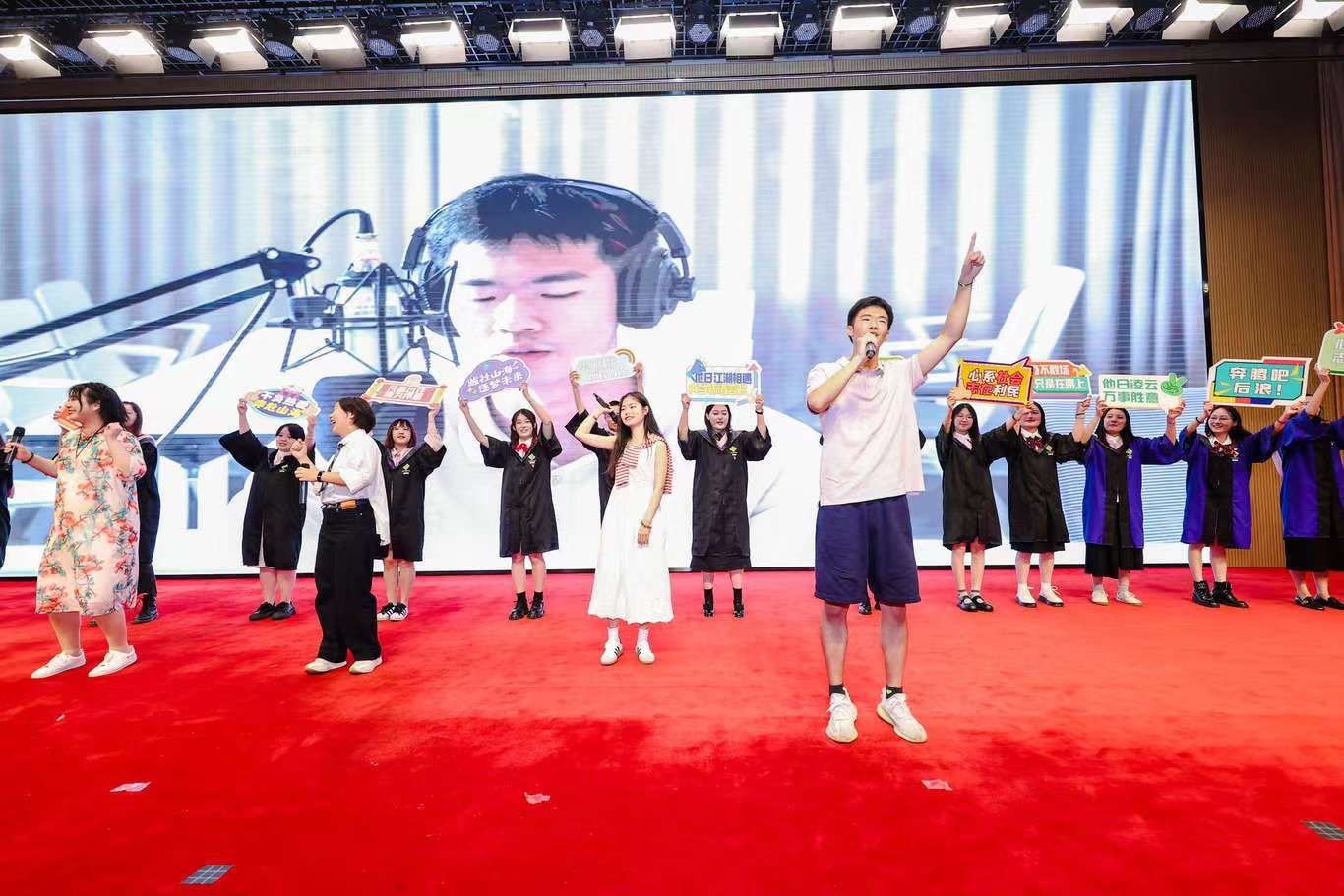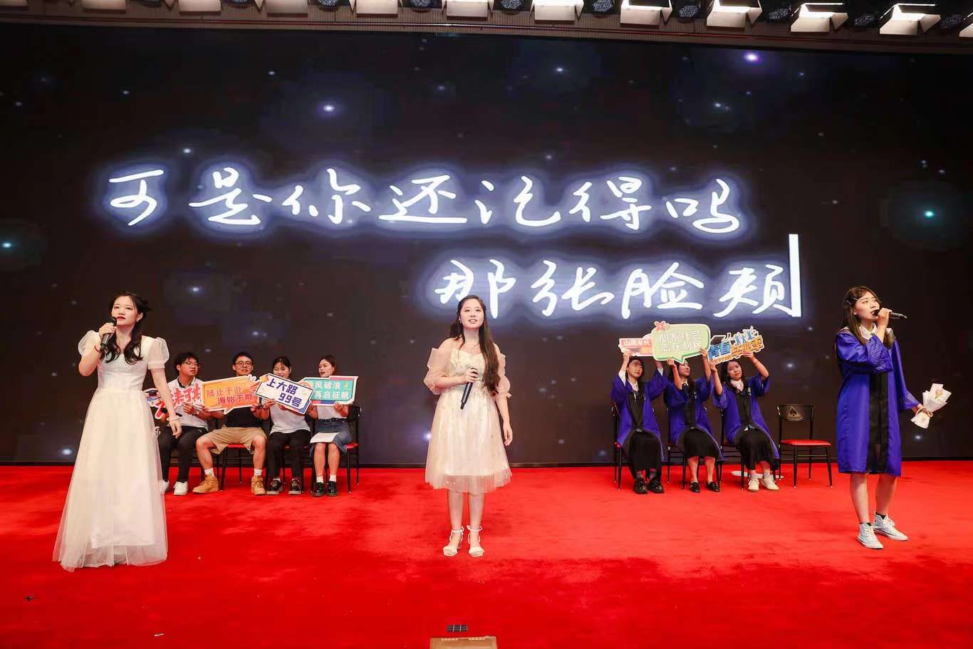 接着,本科毕业生程雨苗、徐璐、杨路程、范佳枫等同学带来了歌曲串烧表演《再见,青春》,多位毕业生共同演唱了毕业原创歌曲《跨越山海》。
