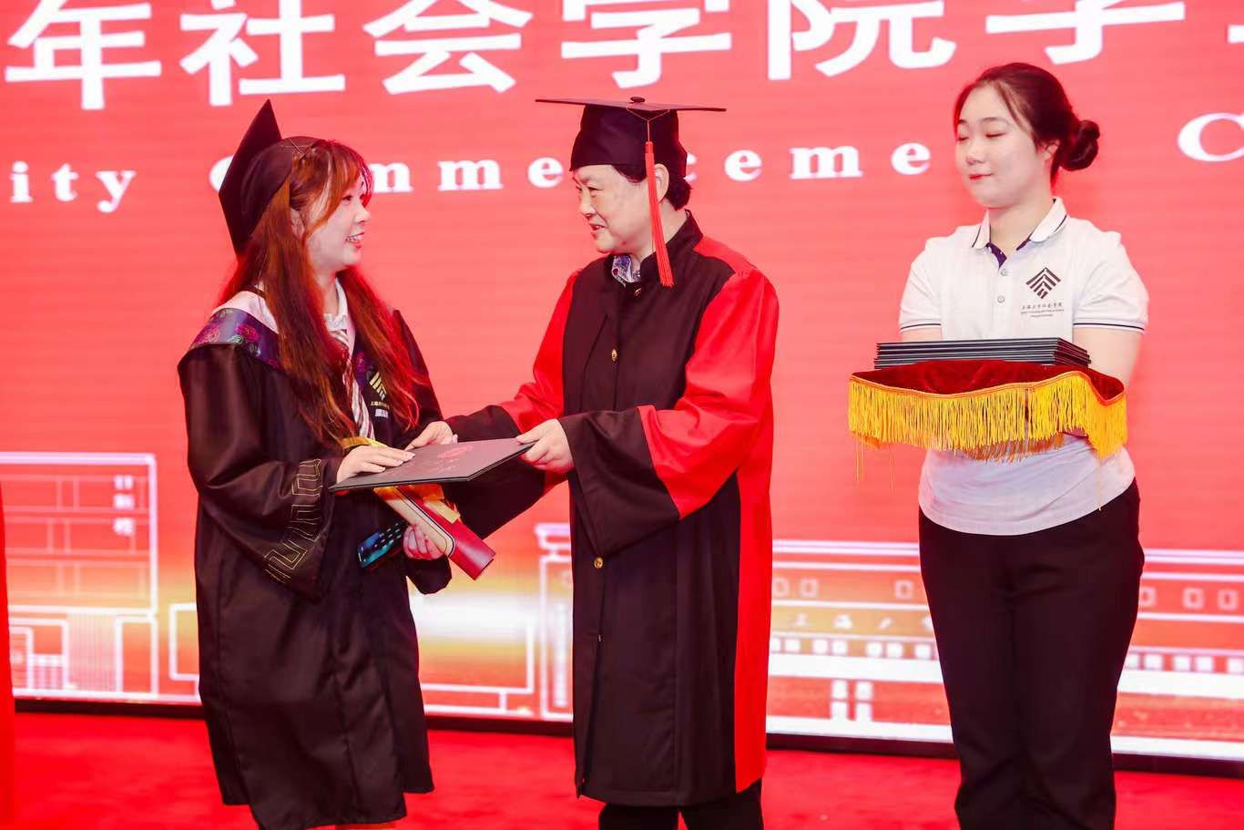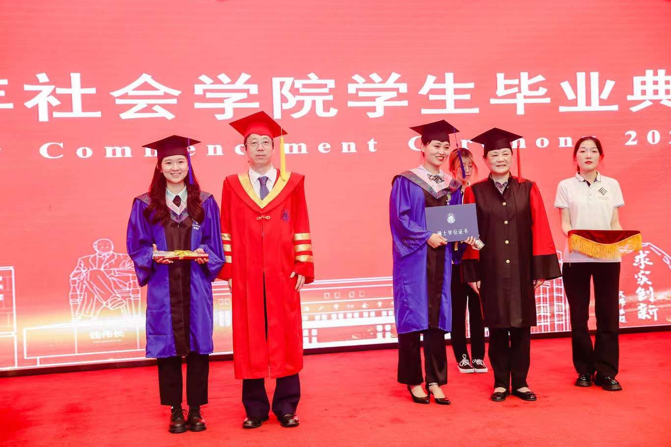 校党委副书记、纪委书记段勇,永利集团88304官网社会学院学科带头人、上海研究院第一副院长、永利集团88304官网“伟长学者”特级岗教授李友梅,社会学院党委书记杨锃,社会学院院长黄晓春为毕业生们逐一授予学位证书,并拨穗正冠,赠送贺信与毕业礼物。
