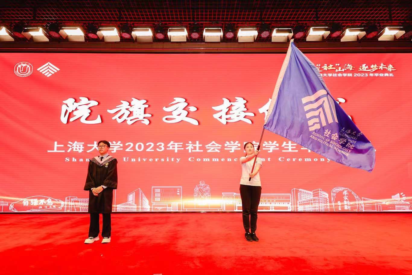毕业典礼在激昂的《中华人民共和国国歌》中拉开了帷幕。倾注了心血与真情的毕业主视频《跋“社”山海 逐梦未来》将同学们在社院学习的回忆铺陈开来,并传达了来自毕业生、老师们的真切祝福。毕业生代表李文涛和新生代表徐海瑶也随后进行了院旗交接仪式。