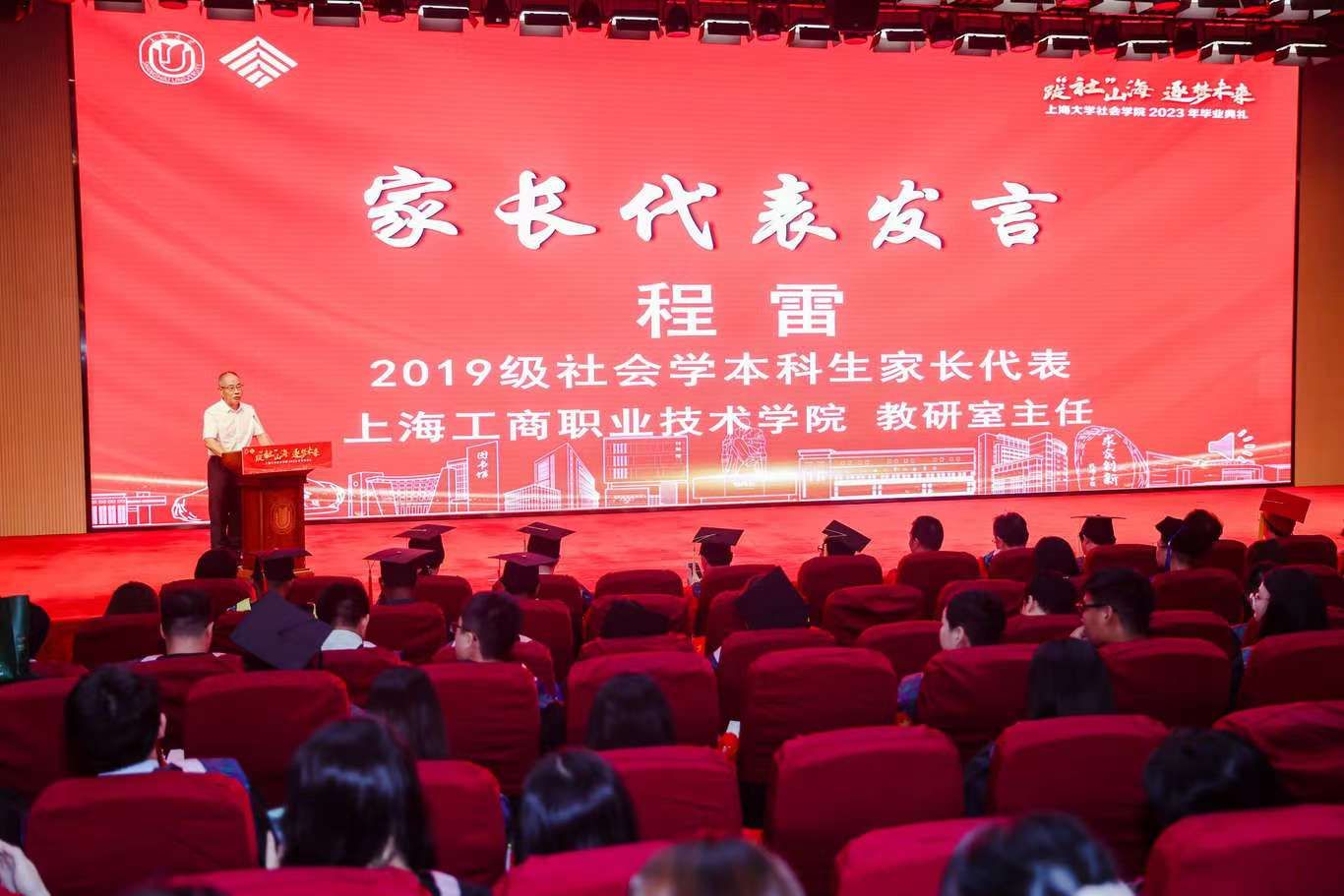 2019级社会学本科生家长代表、上海工商职业技术学院教研室主任程雷先生作为家长代表上台发言。身在一个拥有三代“上大”基因的家庭,他对永利集团88304官网怀着一份深厚的情谊。程雷先生对校院领导、老师和辅导员们耐心细致的陪伴表达了深深的感激。同时,他也祝福毕业生能够成为善良、幸福的人,在未来的日子里谨记校训院训,自强不息、扎根田野、展望未来。