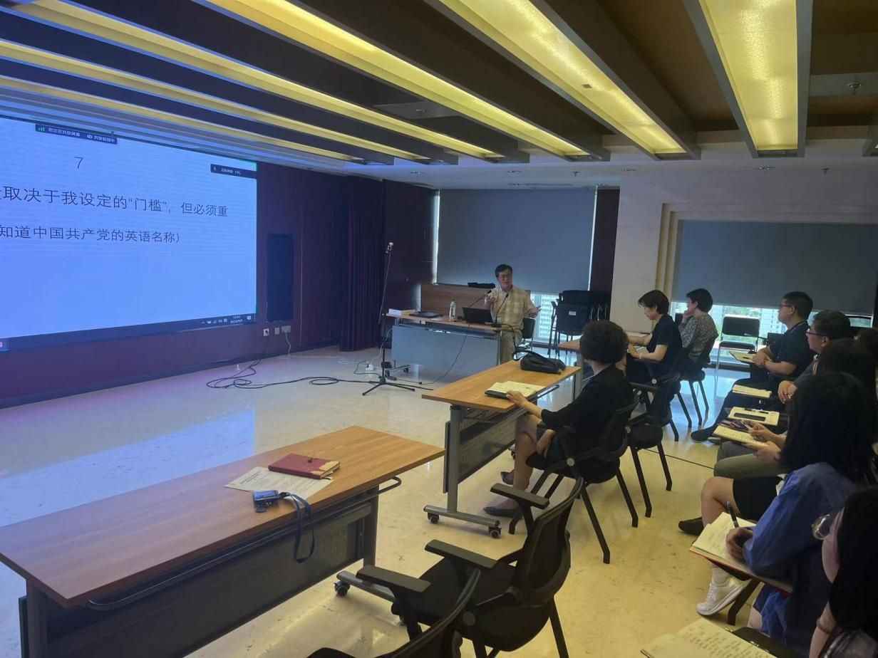 接着,双方一同观看学习了视频《习近平总书记在中共中央政治局第五次集体学习时的重要讲话精神》。国家留学基金管理委员会第四党支部书记、美大事务部主任孟莉、国际部党委书记王丽娜、文学院党委书记陆甦颖、研究生院常务副院长张勇安结合重要讲话精神,先后介绍了各自部门党组织的情况及主题教育的开展情况。
