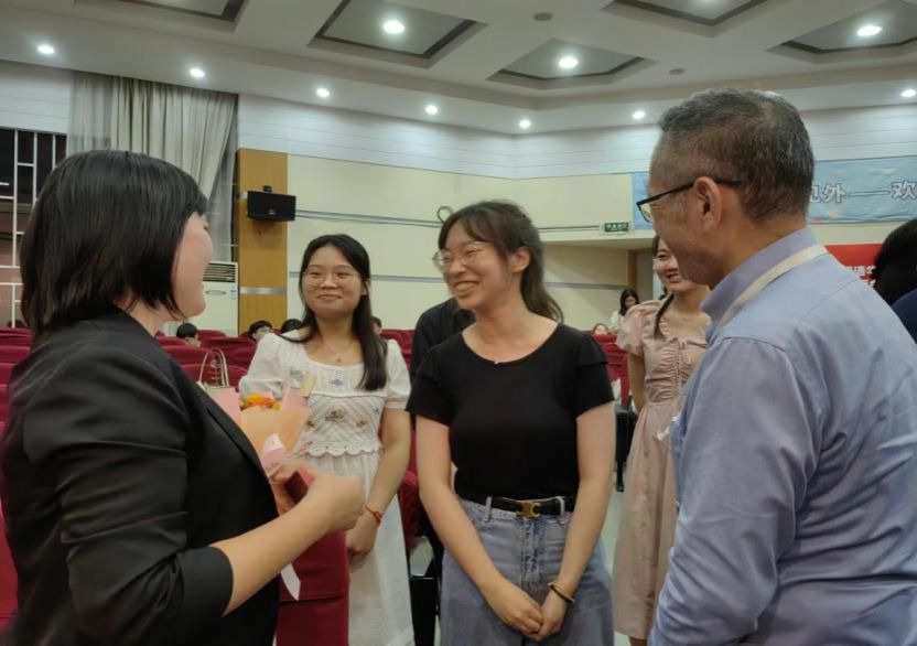 教师节即将来临,为提前预祝老师们节日快乐,2023级研究生代表们纷纷为导师们送上花束作为礼物,台下的同学们同声祝老师们节日快乐。