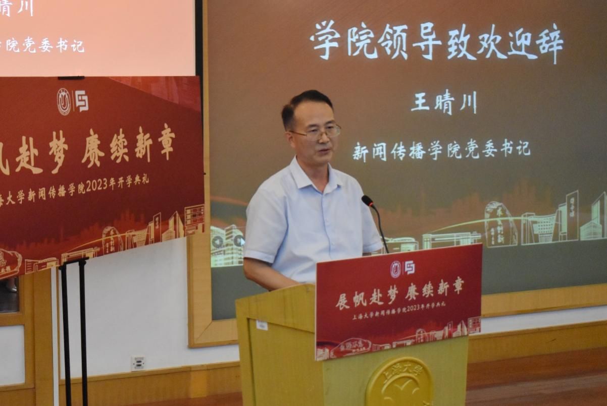 出席此次开学典礼的有新闻传播学院党委书记王晴川,学院党委副书记、院长严三九,学院党委副书记、副院长王智君,副院长赵为学,副院长牛盼强,上海研究院世界传媒研究中心执行主任吴信训教授,新闻传播系张咏华教授,广告学系查灿长教授,智能传播系负责人王虎,智能视听系支部书记刘峰,智能视听系负责人虞国芳,以及专业教师代表、班主任、辅导员、行政老师等,一起见证了新生入学这一重要时刻。本次开学典礼由2023级新闻与传播硕士研究生于昊岑与2022级广播电视学本科生肖芸主持。