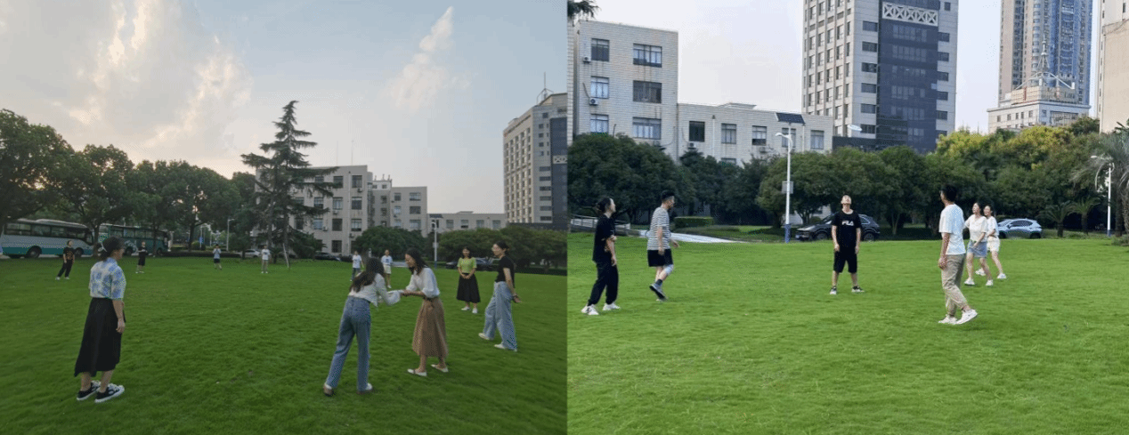 在实践探索部分。首先,由研究生党建中心委员陈梦婷带领大家开展红色剧本杀游戏——《清澈的爱》。在剧情推动下,参与的同学们追忆起那段红色历史、重温了峥嵘岁月,走进了那个风云激荡但真理永存的年代,也深刻学习体会了地下党员李白的英雄事迹,不仅感受到了革命先烈坚定不移的理想信念和无私奉献的崇高品德,也再次坚定了自己的爱国情怀。随后,在团总支副书记刘巾晖、吴艳、瞿宇菲带领及引导下,进行了有趣的破冰游戏活动,拉近了党建中心和团总支新老成员的距离,并分小组进行了 “击鼓传花”、“飞盘”等团体素质拓展项目,帮助参与的同学们在快乐中学会合作、在合作中增强集体归属感。