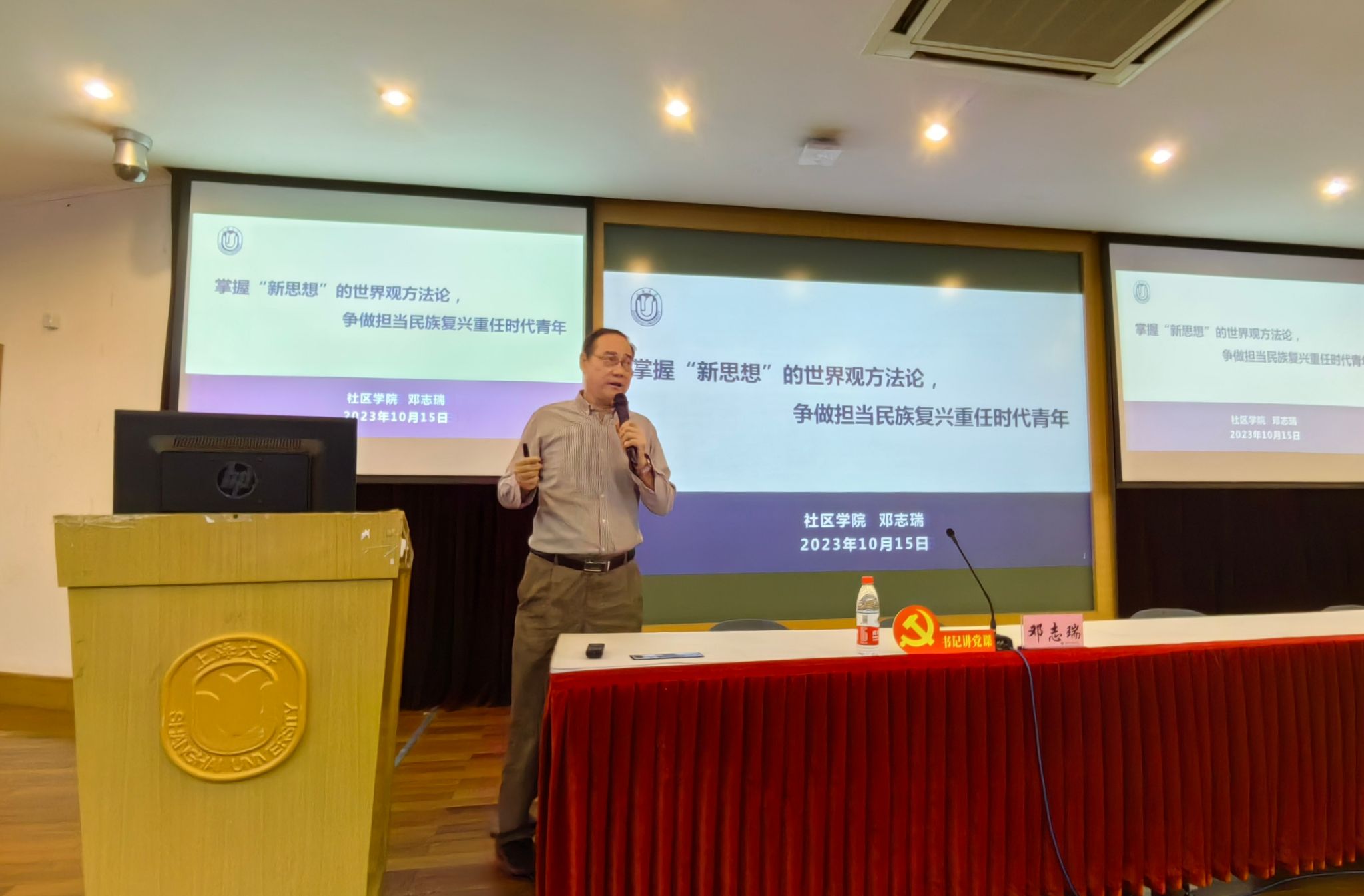 接下来,邓志瑞书记做开班动员,并以《掌握“新思想”的世界观和方法论,争做强国有我新青年》为题作专题报告。邓书记以“三观就是总开关”的观点引出主题,在政治、思想、行动三个方面,要求学员自觉自愿听党话、跟党走;讲述了贯彻学习习近平新时代中国特色社会主义思想主题教育的心得感悟,突出了开展主题教育的重要意义;论述了“学习贯彻党的创新理论的必要性和重要性”,希望所有学员用“新思想”的世界观和方法论来引领自身成长。邓书记鼓励新生奋斗进取,勇敢担负起中华民族伟大复兴的历史重任,努力成为社会主义事业的建设者和接班人。