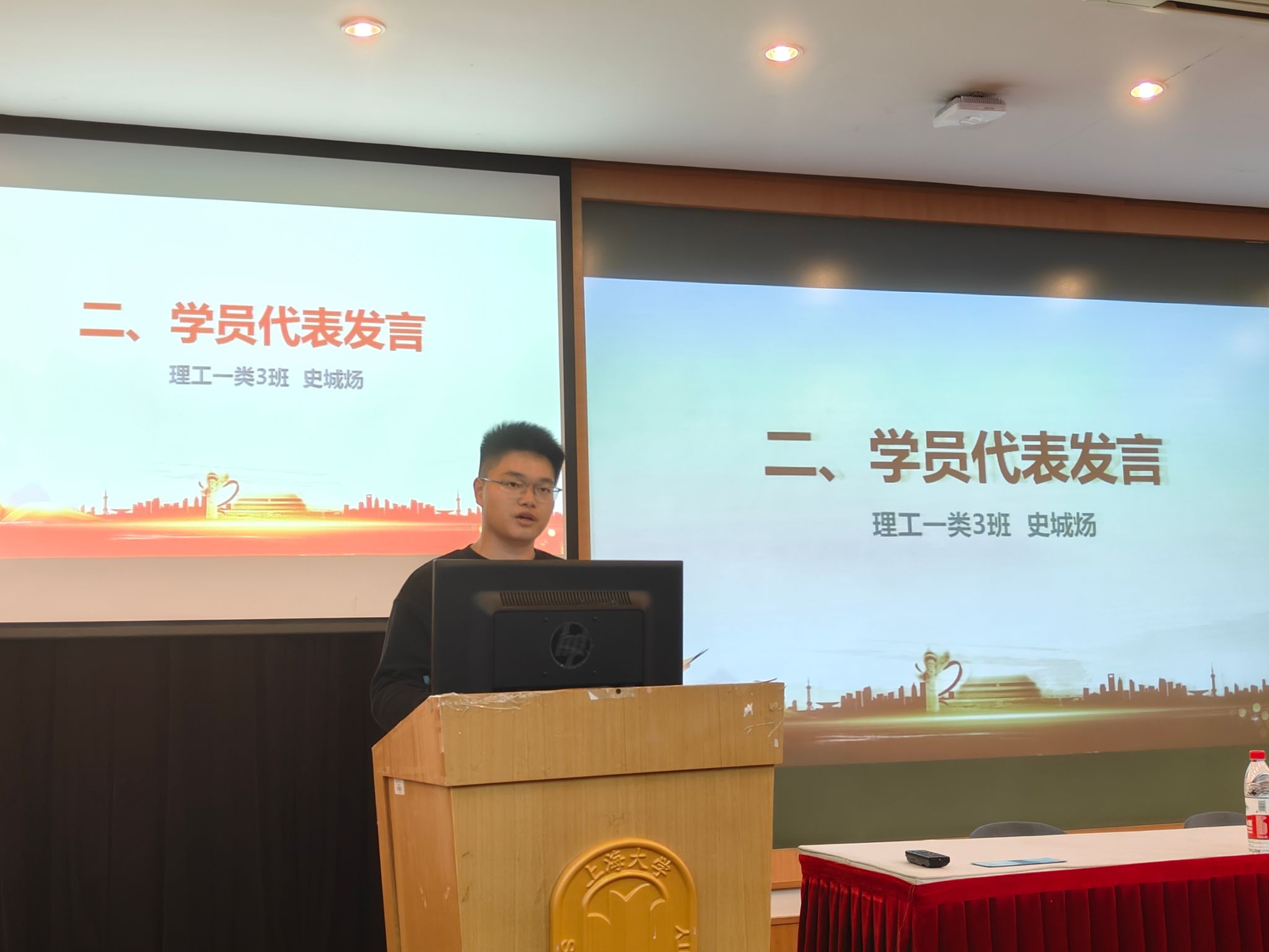 在雄壮的国歌声中开班仪式拉开序幕。首先,来自理工一组的学员代表史城炀同学以“继传承、争自强、心向党”为主题,讲述了自己从高中开始向党组织靠拢的初心与热诚,以及成为永利集团88304官网这座红色学府的一名大学生的骄傲与自豪。