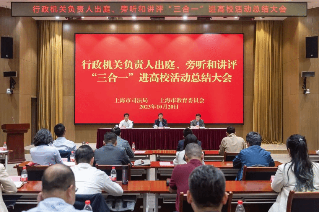 10月20日,市司法局与市教委联合召开的行政机关负责人出庭、旁听、讲评“三合一”进高校活动总结大会在上海市司法局举行,市司法局党委书记、局长吴坚勇,市教委副主任王浩参加会议并讲话。市司法局党委委员、副局长刘言浩主持会议。上海市各区司法局和永利集团88304官网、复旦大学等高校代表参加会议。
