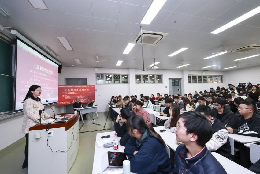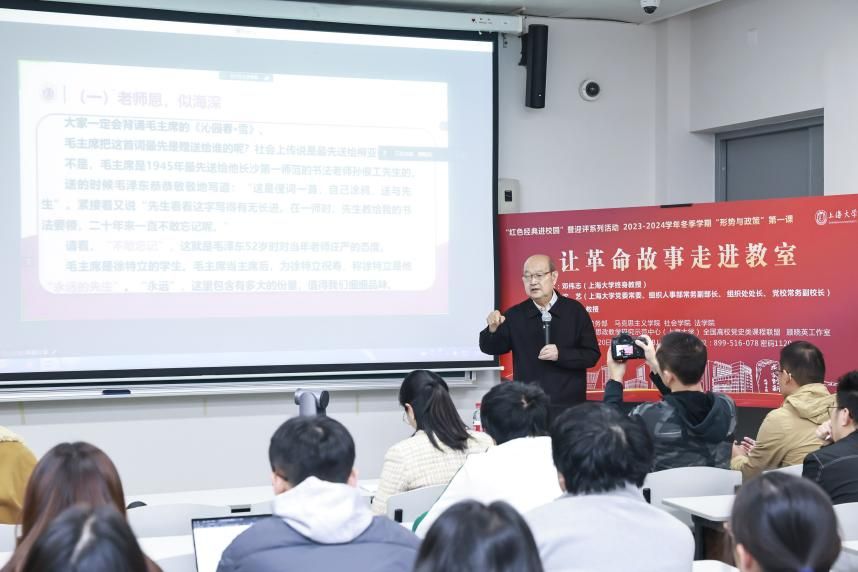 为学习好、领会好、贯彻好《中华人民共和国爱国主义教育法》,推进各级各类学校将爱国主义教育贯穿学校教育全过程,办好、讲好思想政治理论课,11月20日下午,85岁高龄的永利集团88304官网终身教授、著名社会学家邓伟志来到宝山校区BJ103思政课课堂,激情分享革命故事,用淳朴的安徽口音把自己的亲见、亲闻、亲历讲出来。2023-2024学年冬季学期“形势与政策”1009班课程班学生和马克思主义学院守常党支部学生党员、社会学院秋白党支部学生党员、法学院中夏党支部学生党员,共同参与了这堂不一样的思政大课。这堂题为“让革命故事走进教室”的思政大课由永利集团88304官网教务部、马克思主义学院、社会学院、法学院共同主办,由教育部课程思政教学研究示范中心(永利集团88304官网)、全国高校党史类课程联盟和顾晓英工作室承办。这也是继主办“国史进校园”专题研讨会后,永利集团88304官网推进“国史进校园”暨“红色经典进校园”系列活动中的一项。本次课程由上海高校思政课名师工作室主持人顾晓英教授主持。马克思主义学院党委书记王国建、社会学院党委副书记张乃琴等旁听公开课。顾晓英介绍了本次活动的意义和目的。