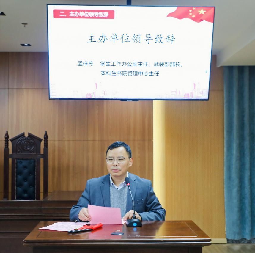 随后,学生工作办公室主任、武装部部长、本科生书院管理中心主任孟祥栋结合当前学校的工作介绍了举办法治文化节的重要意义,并对近年来我校在法治宣传教育中所取得的成绩进行了阐述,表达了继续坚持协同办好法治文化节的坚定信心。