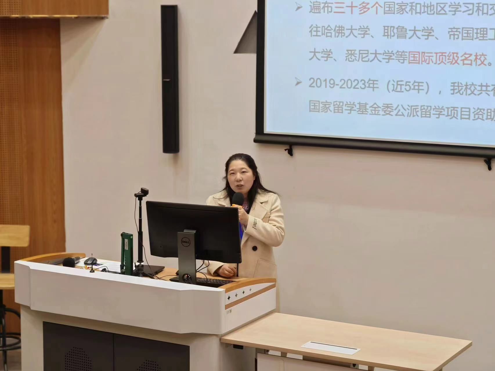 张雪剑介绍了我校的国际化师资队伍现状,以及通过“国(境)外访学计划”等举措不断提高我校教师国际化水平的努力。