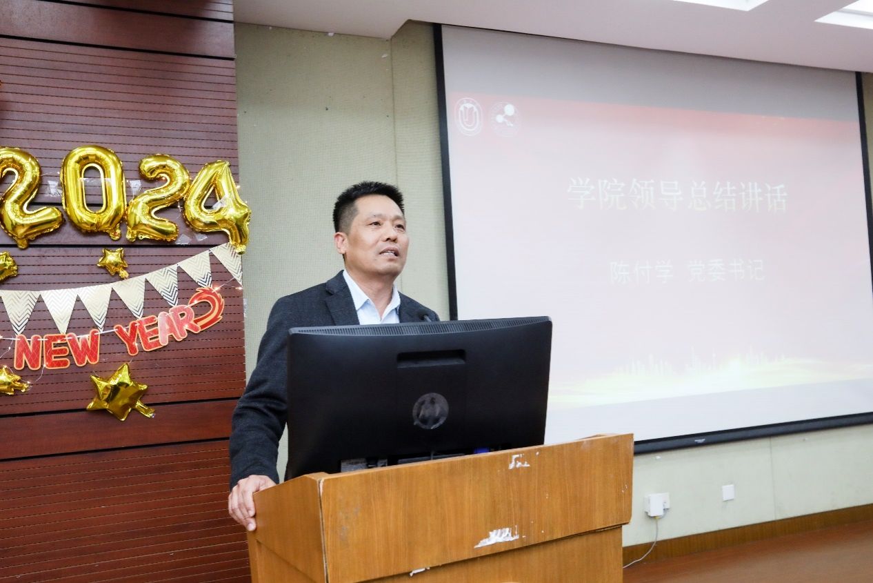 最后,党委书记陈付学作总结讲话。陈书记希望新的一年,老师们继续把教书育人的工作做好,同学们继续努力学习,做好科研工作。同时希望全体师生可以有一个健康的身体、开心的心情,投身到新年的科研和奋斗中去。