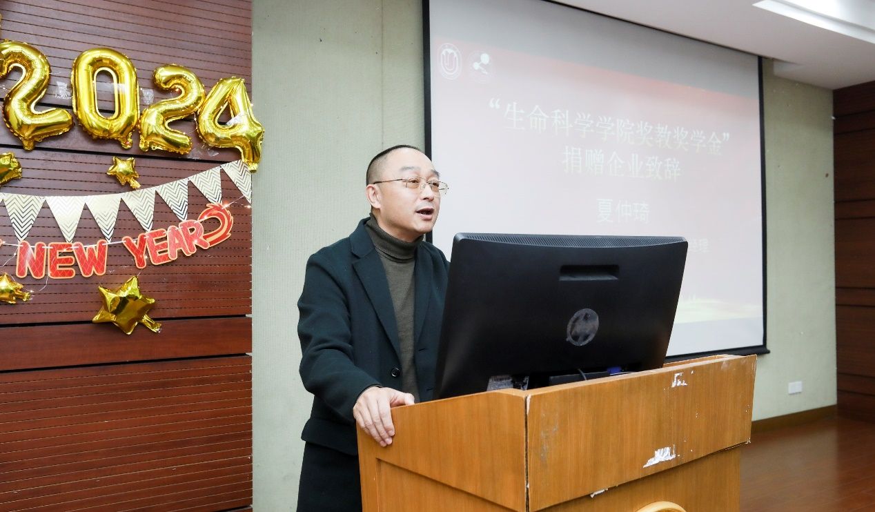 生命科学学院发展离不开社会各界的关心与支持,夏仲琦先生是母校培养的杰出校友之一,他代表上海奥录生物科技有限公司出资捐赠,设立了“生命科学学院奖教奖学金”,大力支持生命学院人才培养,他代表捐赠企业为老师和同学们致辞,希望生命学院接下来的一年心怀希望,沉下心来投身科研,在未来五到十年内达到自己心中的理想。