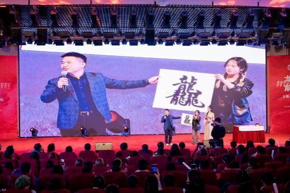 本次活动的主题词为“龙行龘龘 前程朤朤”,为帮助现场观众了解主题词含义,国际教育学院副院长裴雨来教授在汉硕辅导员孙先君老师的配合下为观众现场开展了一节“汉语课”。孙老师现场创作书法,裴老师则在一旁向现场观众讲解“龘(dá)”和“朤(lǎng)”的读音及意义。话毕,孙老师书写的一幅行云流水的“龘”字便展示在观众眼前,两位老师通过现场互动将气氛又一次点燃。“龙行龘龘 前程朤朤”,在崭新到来的龙年,前方的道路将充满光明。
