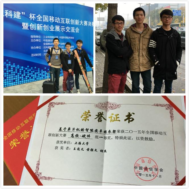 大赛实际参赛作品151项,其中高校组99项,社会组52项,经过评委评审,最终结果如下:特等奖:2项、一等奖:13(高校)+ 8(社会)=21项、二等奖:26(高校)+ 17(社会)=43项、三等奖:59(高校)+ 26(社会)=85项,其中我校通信与信息工程学院参赛作品“基于单片机的智能安卓晾衣架”(翔英学院2013级本科生王逸凡、黄强文、胡杰),获得“全国总决赛高校硬件组一等奖”。