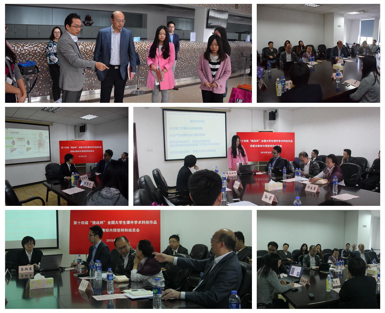 8点30,各参赛团队先在A400学生学生服务中心进行项目展示,各参赛队精心准备了各自的展示材料并模拟全国决赛会场要求布置,实战演练决赛过程。9点,在 A404会议室,预答辩和动员会正式开始。会议伊始,校团委负责老师简要介绍了我校参与第十四届“挑战杯”竞赛的相关情况,自2014年10月启动以来,历经宣传发动、项目征集、校内选拔、培训指导、参加市级选拔、报送全国初赛等环节,入围全国决赛。随后来自生命学院、机自学院、社会学院、材料学院和美术学院的参赛同学逐一登台进行答辩展示,与会领导和专家进行点评和建议。