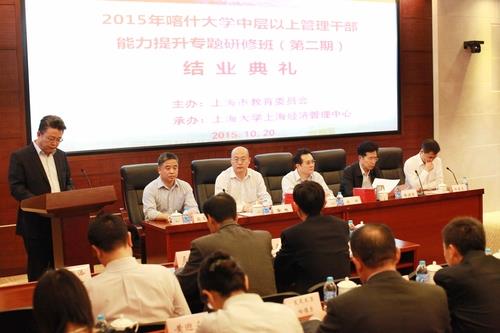 2015年10月20日,喀什大学中层以上管理干部能力提升专题研修班(第二期)结业典礼在永利集团88304官网宝山校区乐乎新楼思源厅隆重举行,上海市教卫党委副书记沈炜、喀什大学党委书记、副校长徐源智、永利集团88304官网党委副书记、副校长徐旭、上海市对口支援新疆工作前方指挥部人才民生组组长陶文捷、永利集团88304官网经济管理中心主任山鸣峰等领导应邀出席,结业典礼由上海市教委人事处处长周景泰主持。