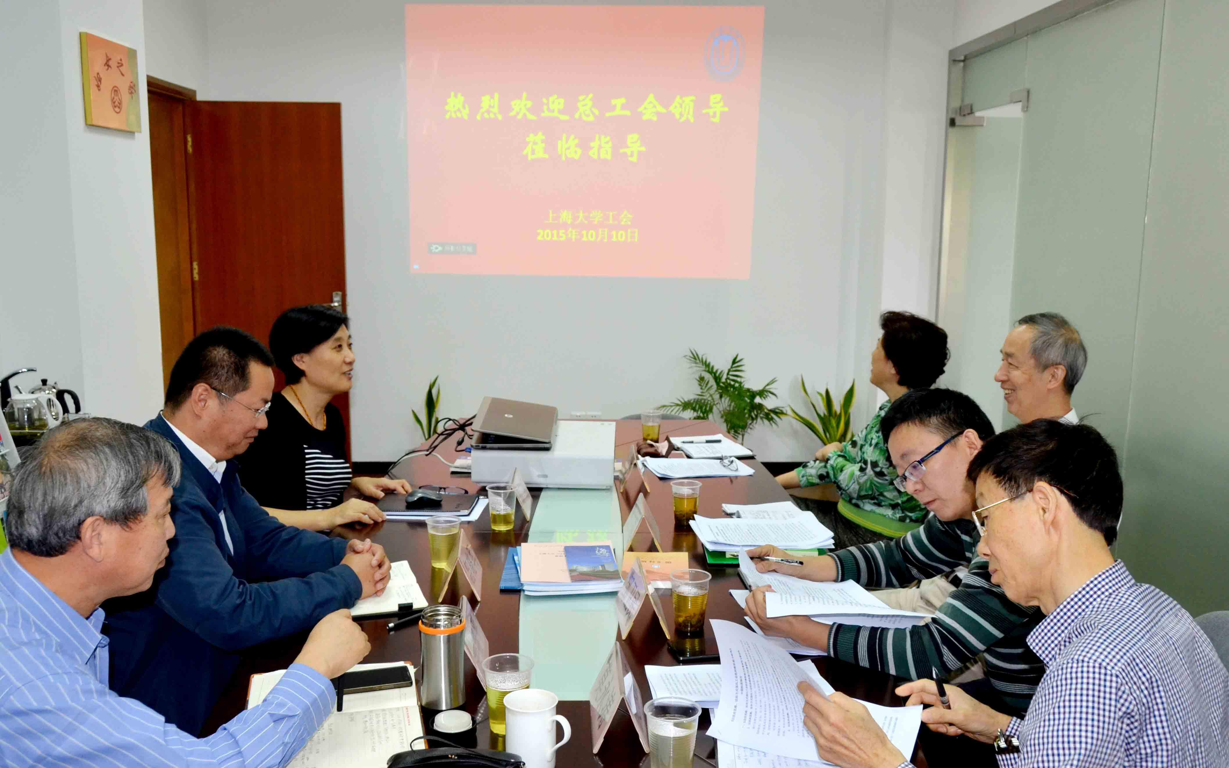 10月10日上午,市总工会工运研究会副会长兼秘书长张立群,市总工会研究室邹卫民,市工运研究会沈新月、莫永涛等一行4人来到我校调研上大工运理论研究及2015年市总工会委托课题的进展情况。校工会常务副主席顾红、副主席吕晓军,原校工会常务副主席姜继平热情接待了他们。