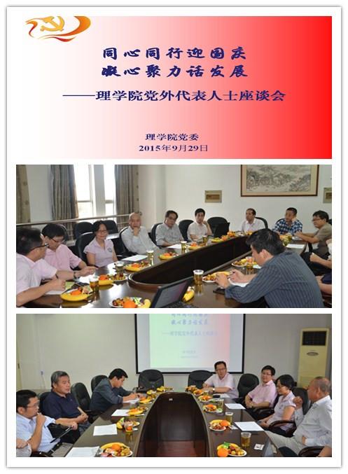 9月29日上午,理学院党政班子成员及来自学院各系所民主党派、无党派人士、归侨侨眷、留学归国人员、中青年党外后备人才及专业技术骨干的党外人士代表近20人欢聚一堂,喜迎国庆,共话发展。座谈会由学院党委书记盛万成主持。