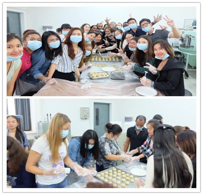 在生命学院的食品工艺制作室,留学生们分为六组,分工合作,有喜盈盈调馅儿的,有乐滋滋和面的,有专心致志裹馅儿的,有小心翼翼压模的……大家有条不紊地进行着每一步加工制作,那一份认真的神态使人感到他们在精心制作独一无二的艺术品。最终,当成排的月饼放入烤箱烘烤时,同学们翘首以盼,等待看到自己最后的成果。烘烤20分钟后,香喷喷的月饼就出炉了。大家迫不及待地将这美味纳入口中,舌尖的那抹香甜,就好像家的温暖,让人回味无穷。“小饼如嚼月,中有酥和饴”,其中包涵的是甜甜的牵挂,满满的思念。