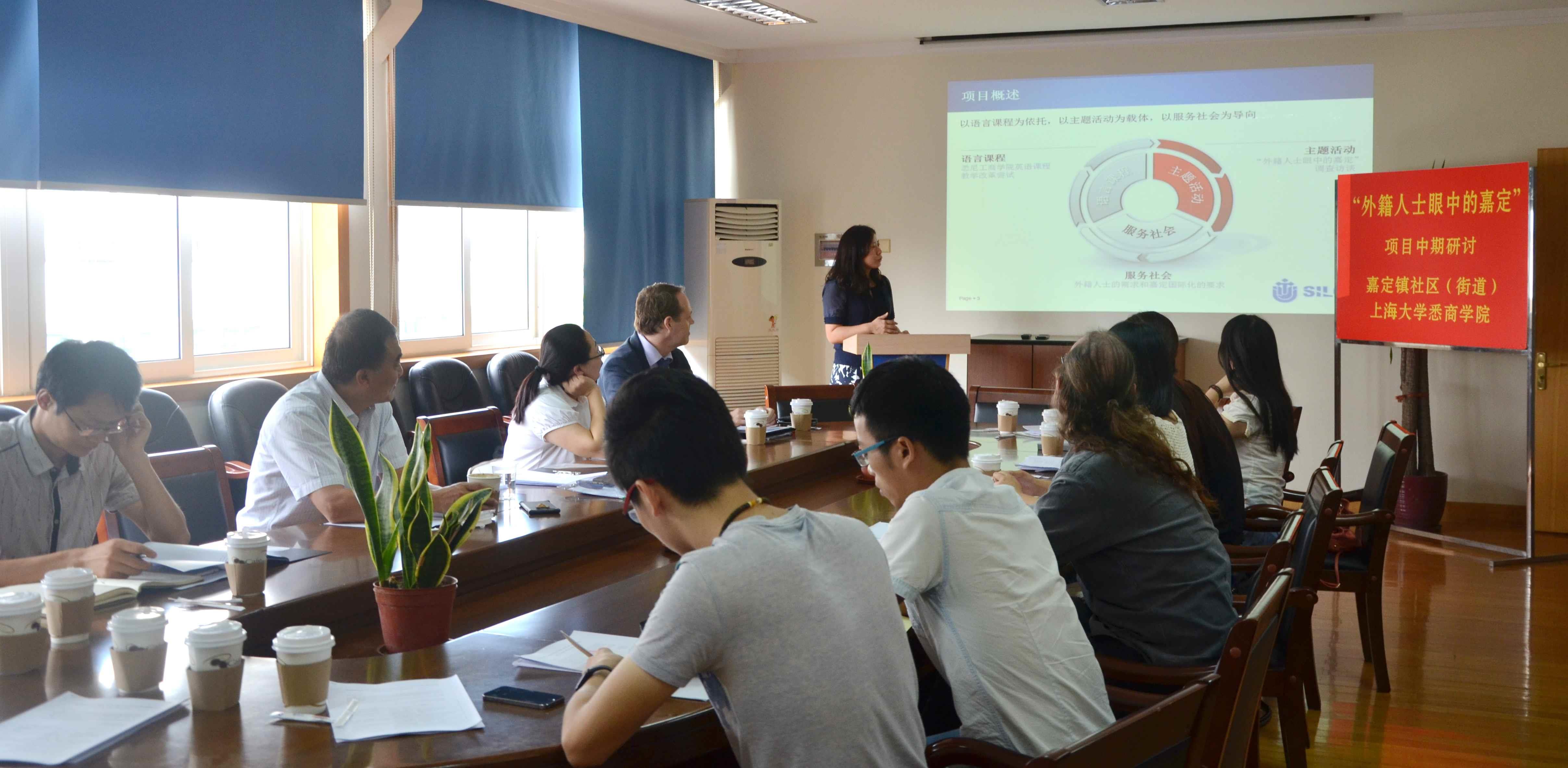 2015年9月18日下午,嘉定镇社区(街道)和永利集团88304官网悉尼工商学院精神文明共建项目 “外籍人士眼中的嘉定”访谈项目中期研讨会于嘉定校区文荟楼举行。嘉定镇街道办事处李敏部长、嘉定广播电视台崔哲苑等来访,学院党委书记李双、相关教师及学生代表出席了本次研讨会,项目负责人英语系教师顾海悦主持会议。