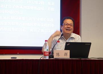 陈挥教授首先从中国战胜日本的历史原因出发进行分析,然后他指出中国共产党的中流砥柱作用是中国人民抗日战争胜利的关键,以爱国主义为核心的伟大民族精神是中国人民抗日战争胜利的决定因素,全民族抗战是中国人民抗战胜利的重要法宝,世界各国人民的支持和帮助为中国人民抗日战争胜利做出了宝贵贡献。他解读抗战精神时指出,抗战精神就是天下兴亡、匹夫有责的爱国情怀,视死如归、宁死不屈的民族气节,不畏强暴、血战到底的英雄气概,百折不挠、坚忍不拔的必胜信念。他最后总结了弘扬抗战精神的现实意义是有利于加强党的执政能力建设;有利于培育和弘扬社会主义核心价值观;有利于实现中华民族伟大复兴的中国梦。