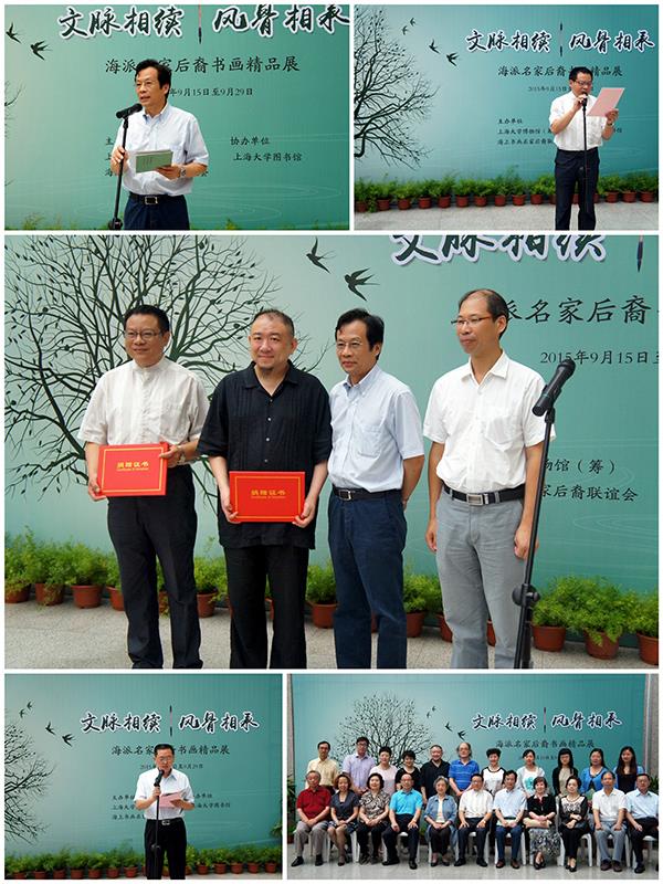2015年9月15日上午,由我校博物馆(筹)与海上书画名家后裔联谊会共同举办的“文脉相续·风骨相承——海派名家后裔书画精品展”开幕式,在我校图书馆展厅正式开幕。校党委常委、副校长汪敏,校党委宣传部副部长兼文明办主任刘绍学,上海市教委新闻宣传中心宣教部部长焦玉玲,图书馆常务副馆长兼博物馆馆长陆铭,海上书画名家后裔联谊会会长吴超及其他名家后裔等嘉宾,以及师生代表一百余人出席了开幕式。
