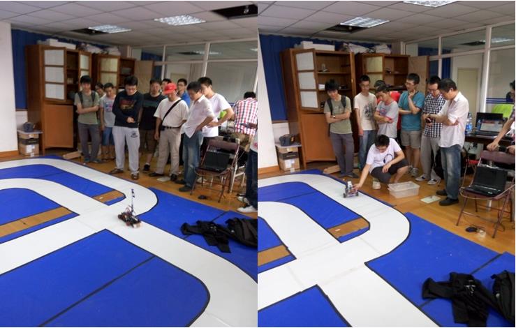 参 赛选手与前来参观比赛的同学们早早的聚集在了比赛现场,选手们争分夺秒的调试着自己的赛车,为在比赛中脱颖而出做最后的努力,热爱智能赛车的同学们也在兴 高采烈的讨论着自己喜欢的队伍。时间来到了下午三点,陈万米老师宣布本次比赛正式开始,选手们严阵以待,沉着冷静,各个队伍的智能小车轮流上阵,场面精彩 激烈,扣人心弦,看到一辆辆小车潇洒的身姿,参观的同学们鼓掌叫好,非常兴奋。最终经过将近一个小时的激烈比赛,决出了冠、亚、季军,其中,冠军队black摄像头小车以46秒的优异成绩跑完整个赛道,赢得了老师和同学们一致的赞许与掌声。