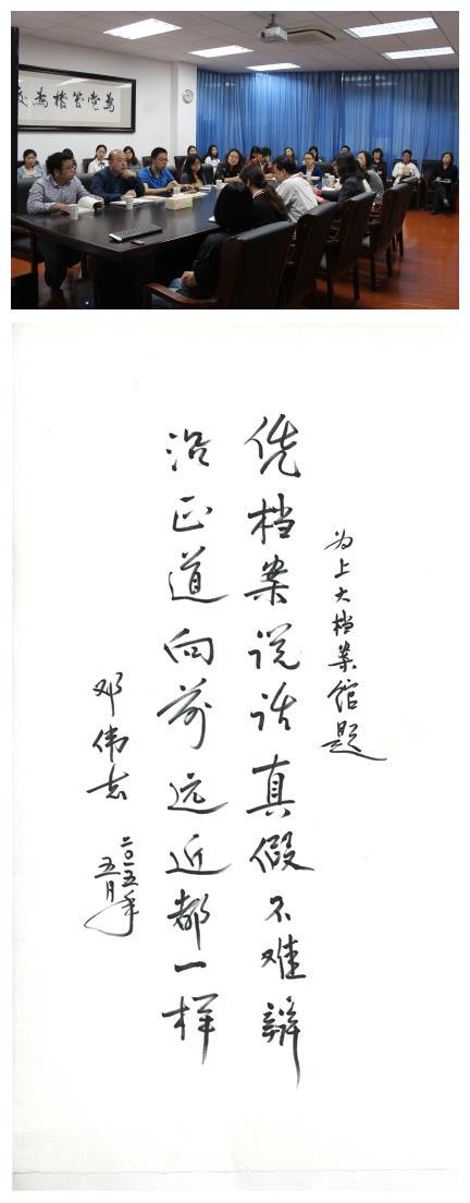 座谈会即将结束之时,经常来馆利用档案的邓伟志教授托人送来一份为永利集团88304官网档案馆亲笔题写的字书--“凭档案说话,真假不难辨;沿正道向前,远近都一样”,这既是对档案馆工作的勉励,也是对进一步做好档案服务利用工作的期许。