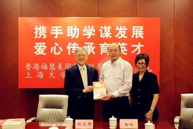 影视学院党委书记王晴川、影视学院常务副院长何小青对学院的基本情况进行了介绍,就环上大国际影视产业园区的构建进行了交流,对成立上海电影学院的进展和思路进行了探讨。会上,赵元修先生与辜怀箴女士向全体与会人员赠送了星云大师的著作《人生百事》。论及现一批资助学生的状况,两位都露出欣慰的笑容,无论生活上还是学业上,学生们与“赵叔叔”、“辜阿姨”都进行了密切交流。双方都希望就未来发展与学生培育进行更好更密切合作。