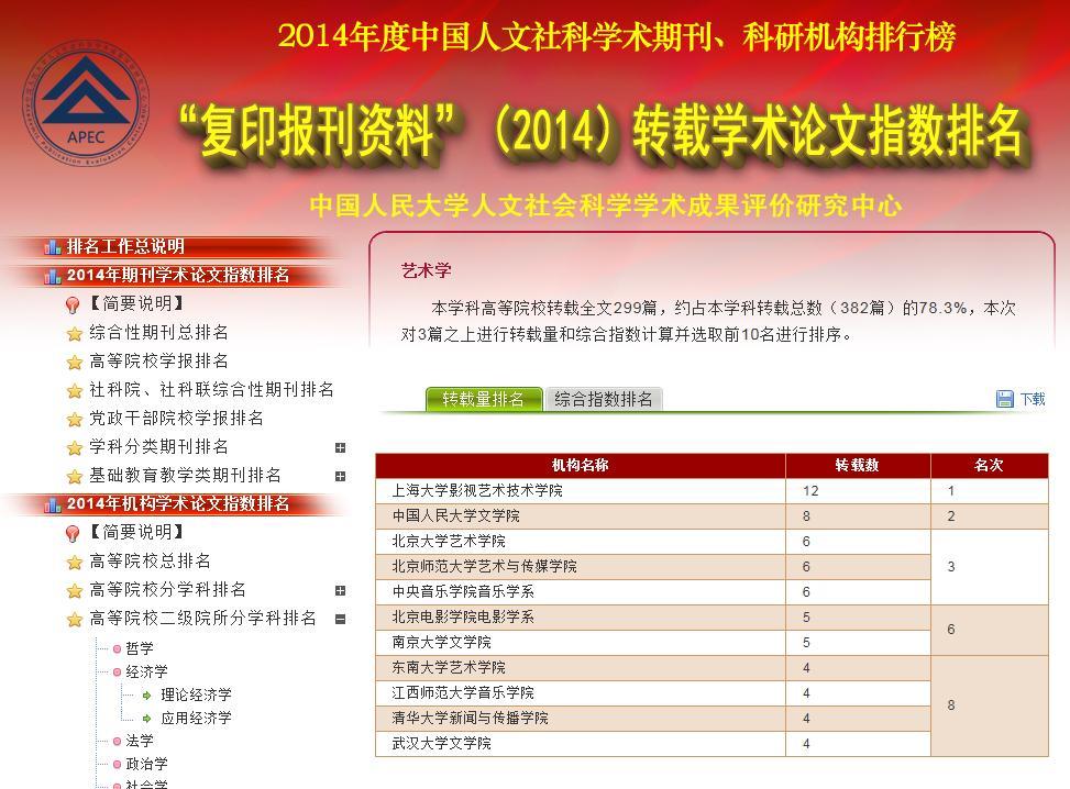 3月31日,2014年度“复印报刊资料”转载学术论文指数排行榜正式发布。在艺术学门类高校二级院所学术论文转载量与综合指数这两个核心指标方面,永利集团88304官网影视学院稳居全国第一。排名第二名至第五名的高校院所分别是中国人民大学文学院、北京大学艺术学院、中央音乐学院音乐学系、北京师范大学艺术与传媒学院。