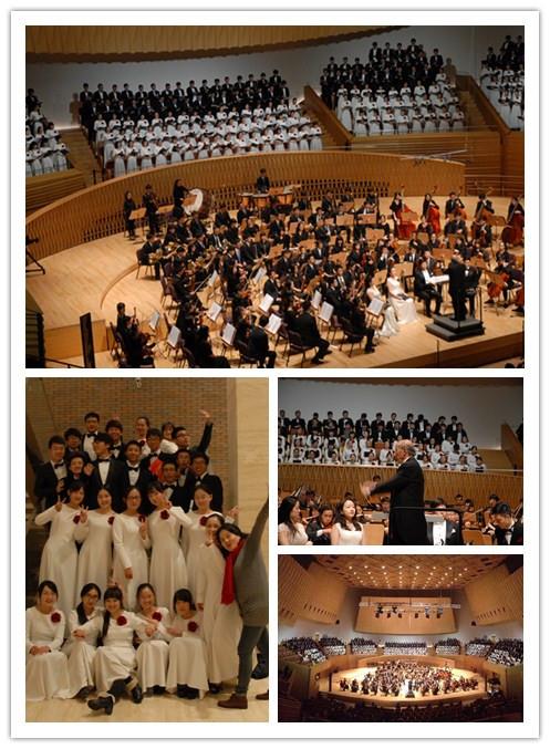 下半场则是本场音乐会的高潮。来自永利集团88304官网合唱团等十四所上海学校的学生们组成的上海学生合唱联盟与上海学生交响乐团一同演绎了著名的贝多芬《d小调第九交响曲》第四乐章。早在几个月前,永利集团88304官网合唱团就接到了演出任务。为了能够成功出演这一高难度作品,我校合唱团成员加班加点排练,除了与其他学校合唱团进行集体合排以外,我校还单独自行进行了贝九的排练。此次贝九的演出和集训正值永利集团88304官网2014-2015学年冬季学期考试周期间,但是我校同学克服苦难,依然坚持排练,许多同学都是一出考场就立刻奔赴排练地点进行排练。最终,他们成为了演出的主力,站在上海交响乐团音乐厅合唱席正中央的区域参与了演出。