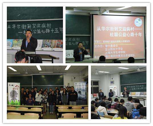 可能很难想象,像杜聪先生这样一位哥伦比亚大学学士、哈佛大学硕士、瑞士联合银行驻香港联席董事、法国银行副总裁的成功职场人士,如今却专注投身于公益事业,成为了一名防治艾滋病、救助艾滋遗孤的全职志愿者。带着这样的疑问,全场师生开始认真聆听杜先生的公益历程。中学生时代,他移民到美国旧金山,在80年代初,美国几大城市突然爆发出艾滋病,他身亲经历了熟悉的老师、朋友因患有艾滋病而死亡、恐惧和遭到歧视,当时就触动他开始非常关注艾滋病。回国工作后,他了解到中国对艾滋病的无知、封闭和歧视,之前国外生活经历使他看见了世界艾滋病的状况,因此引起了他对中国艾滋病未来状况的担忧,出于不愿让中国像美国一样被笼罩在恐怖的艾滋病阴影之下的初衷,深思后,他与好友创立了智行基金会,毅然开始了一条防艾事业的公益之路,至今已15余年。