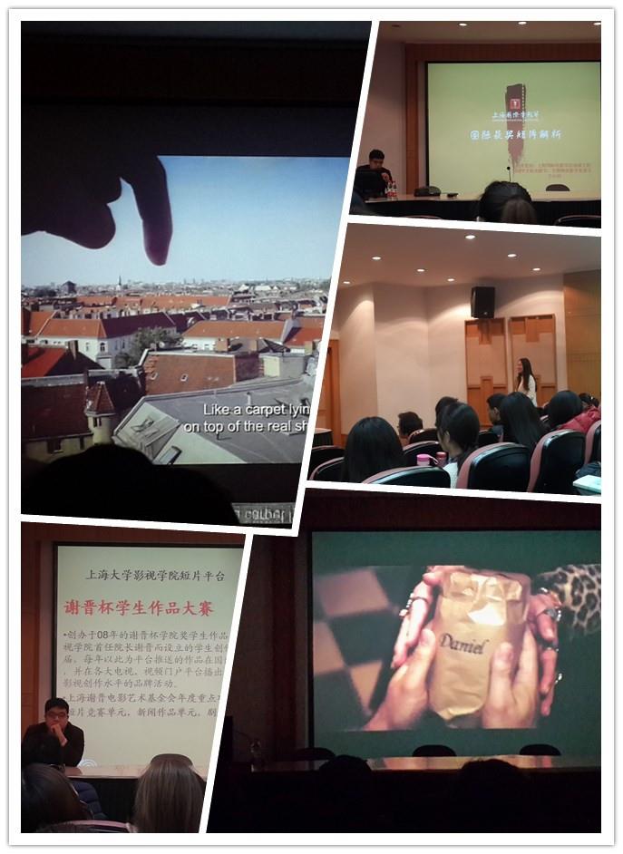 作为14个国际A类电影节之一上海国际电影节主要分为金爵奖、亚洲新人奖和国际短片大赛三个版块,本次讲座主要是根据国际短片大赛这个版块进行的,主讲嘉宾王小钊表示:“设立短片单元具有重要的意义,作为青年导演很有必要先沉下心来,好好拍摄一部内容上能沉淀的短片,没有太多的商业渲染,是对自身拍摄功力的一种磨砺。”他特别将最近很火的《星际穿越》的导演诺兰的处女座《追随》为例子,《追随》是一部时长55分钟的短电影,是诺兰一个人担任导演、摄像、灯光、幕后等工作与只有演员的团队花费一年时间完成的精彩作品, 可见作为青年导演是需要经历拍摄短片的过程来提高自身的能力的,并且寻找属于自己的个人特色。“通过国际短片大赛,用我们的资源,成为你们的推手”王小钊鼓励道。短片电影节主要有记录片、剧情片和动画片三个类型,报名时间为每年的1月1日,于4月30日结束,建议片源是在2年以内拍摄的,5月中旬会公布25部入围影片。王小钊还向同学们讲述了一般入围作品的标准,首先短片的影像质量一定要过关,手持DV的拍摄一般不会考虑。其次故事情节的叙述一定要清楚,不要拖拖拉拉,过于拖沓。导演要从观众的角度出发,对事物的嗅觉,对故事的敏锐和拍摄的角度要有创意,有吸引人的闪光点。一般动画片要明快,通过音乐和人物的动作来表现感情;讲述亲情的、剧情悬疑结局反转的剧情片容易获得好感,还包括天马行空却不失地气和有感人故事的剧情片也是会入选的;记录片则需要有真实情感能穿透人心,猎奇的、隐秘的、地下的。随后王小钊播放了两部今年外国导演的入围的短片和一部获奖短片,都是拍摄具有很强特色和创意的具有反转情节的剧情片,引人思考。
