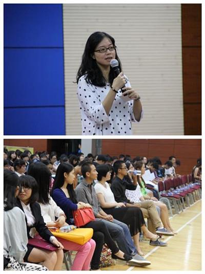 随后,14级辅导员徐娴为此次开营仪式讲话。她对新生的校园生活提出了一些建议。她说,在大学生活中,应该去找寻专业之美、活动之美以及社会实践之美,品味这三个方面的美好、奇妙、隽秀,踏上一段崭新充实的旅程。随后,素质拓展部部长郦烨田简要介绍了“新生适应营”包含的六大板块:大学规划指导、学科经验分享、四六级和雅思困惑解答、社会实践与志愿活动、嘉定文化品读及班级团学活动组织。学生会副主席祝逸云同学向新生们讲述了如何安排好学习,团学和社团工作以及自己的职业规划。13级优秀学生张羽田也就学习方面与新生进行了沟通,良好的学习态度、持之以恒的信念是他学习的秘籍。